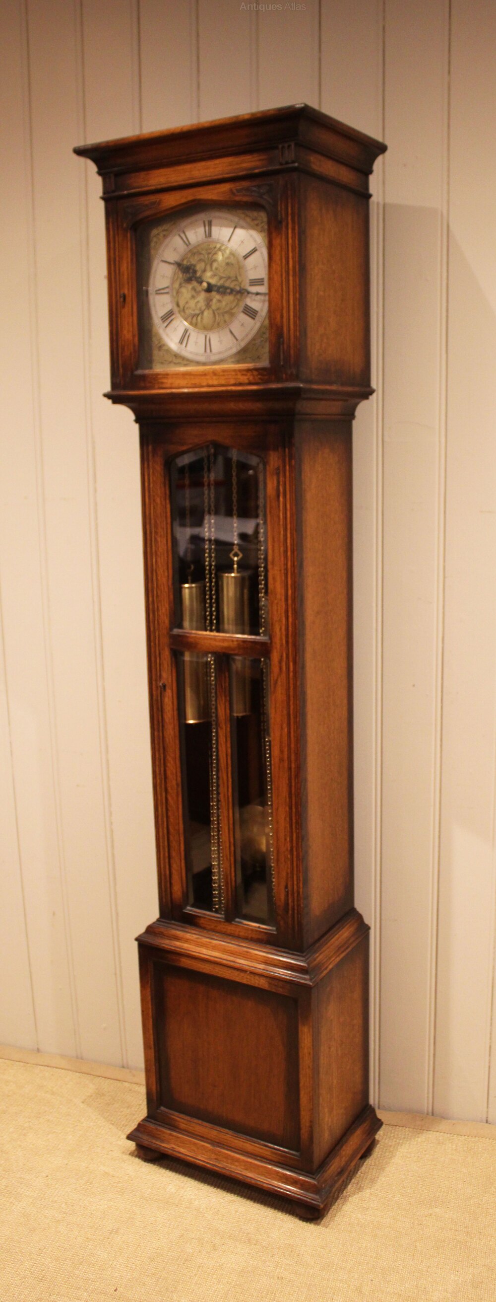 Condition A late 17th Century style longcase clock , it has a square hood, a long glazed door and turned bun feet. The well engraved brass dial has a silvered chapter ring, It has a weight driven Westminster chime movement, that sounds the 1/4\'s and hours on chime bars. The chimes and or strike can be silenced. It has three brass weights and a brass bob pendulum, wound by pulling the chains on a weekly basis. Made by Peerless .Delivery & set up avaliable within a 100 mile radius of London