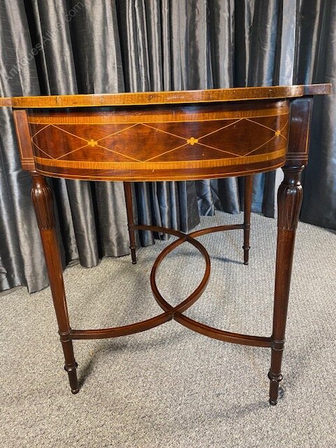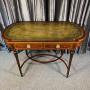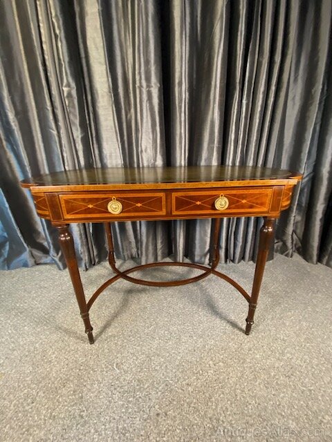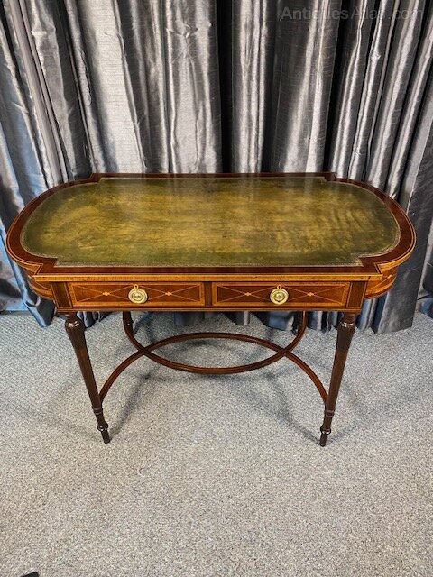 This stunning occasional table featuring a beautifully tooled and aged looking leather hand dyed top in a mottle green bordered in gilt detail , the table has two mahogany lined drawers with gold gilt handles and inlays around of boxwood and satinwood, the table stands on turned legs with beautiful shaped stretcher bars below, This table could be used as a desk, dressing table or would compliment most rooms of your home.