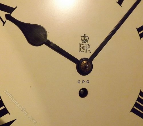 An octagonal dial GPO fusee wall antique clock with ER crown cypher to the 12" original dial. A mahogany case with moulded edging. An 8-day duration timepiece fusee mechanism by Elliot, London. Circa 1955.