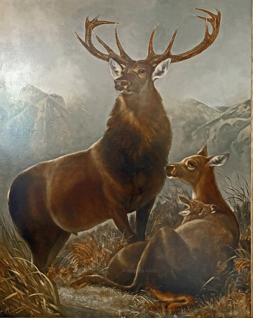 A stunning original oil on canvas painting signed by Robert Cleminson, in its original carved, gilt frame. Robert Cleminson was a painter in oils of landscapes, Highland game and sporting dog pictures and it his animal and dog paintings for which he is best known. He was a follower of Sir Edwin Landseer (1802-1873) and this painting of a Royal stag, hind and fawn is derivative of Landseer’s original Monarch of the Glen oil painting. Landseer was Queen Victoria’s most admired artist.
