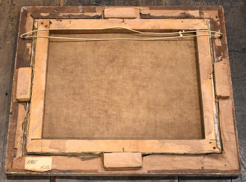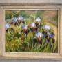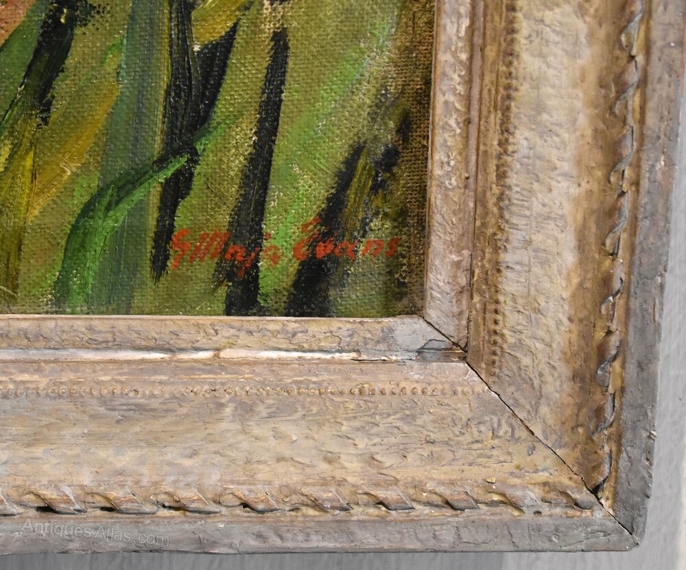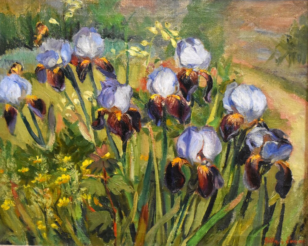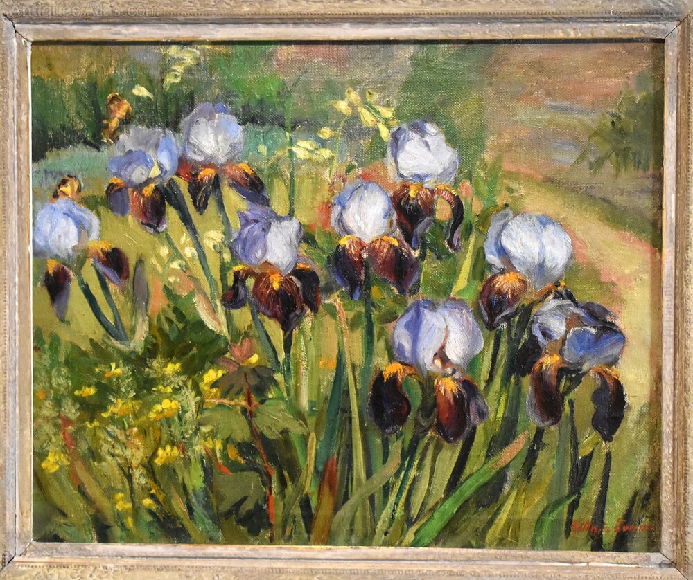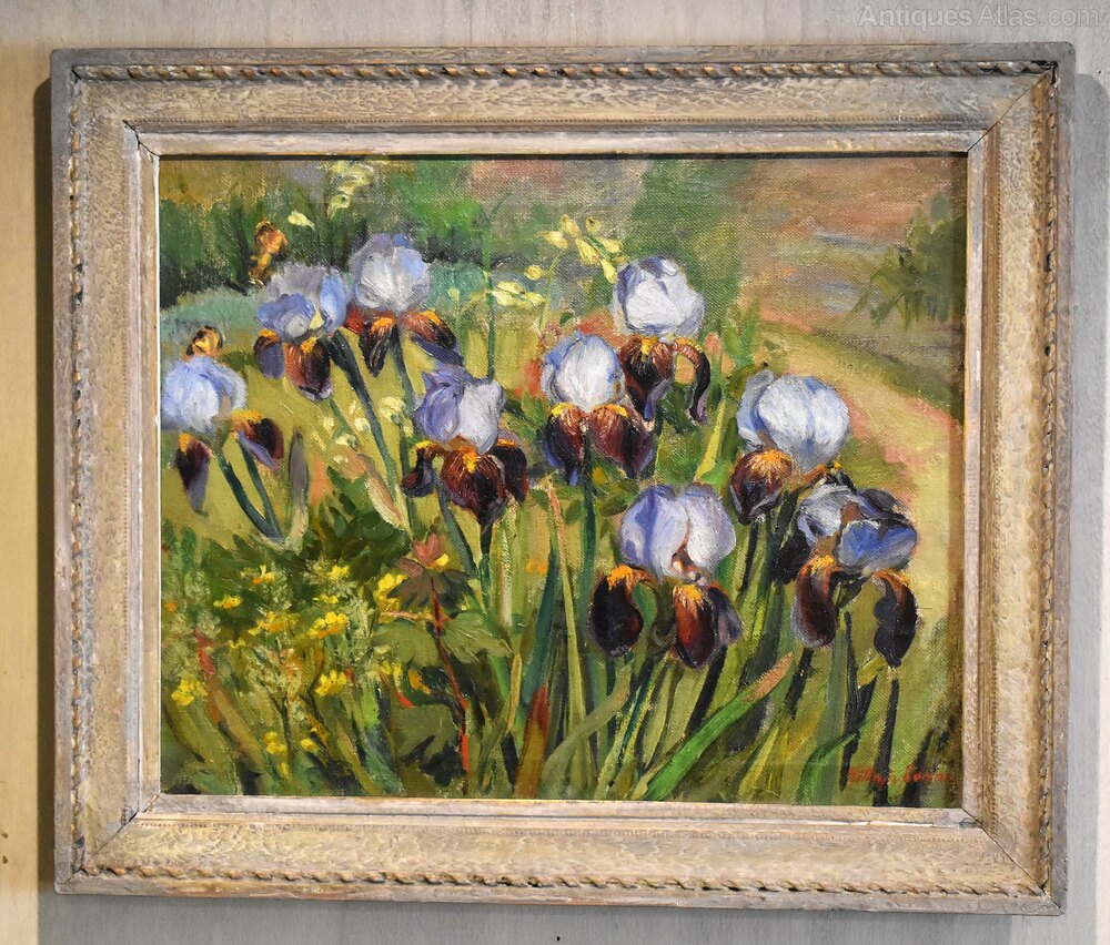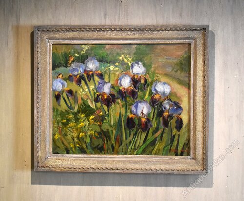 A decorative oil on canvas painting of irises. The work is beautifully done in bright colours and an impressionist manner, depicting a bank of irises in a garden setting. The painting is signed to the lower right with the surname Evans but the first name is illegible. The work is in excellent untouched condition and retains the original painted frame which was likely done by the artist over an old gilt frame. The frame has had some losses to the paintwork and touching in. The work does retain a label on the reverse indicating it was an exhibited piece. The whole is an exceptionally pleasing and decorative work that is ready to hang. C.1930.