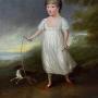 The composition presents a poised full-length figure within a softly atmospheric landscape. Louisa’s luminous white dress is placed against a darker ground, creating strong figure-to-background contrast. Mr. Quiz stands attentively at her side, reinforcing the portrait’s tone of loyalty and domestic steadiness. The work is figure-led, with careful costume definition and a direct, quietly expressive gaze—qualities consistent with refined provincial portrait practice around 1800 and the broader idiom associated with the Romney generation.