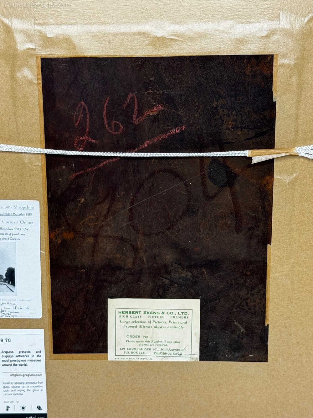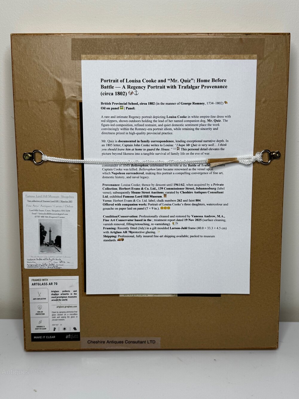 Louisa Cooke (Captain Cooke’s widow) thence by descent until 1961/62, when acquired by a private collection Herbert Evans & Co. Ltd., 139 Commissioner Street, Johannesburg (label verso) subsequently Sloane Street Auctions (London) curated by Cheshire Antiques Consultant LTD exhibited Famous Lord Hill Museum.