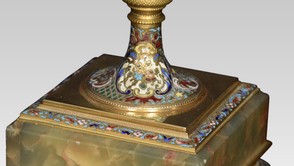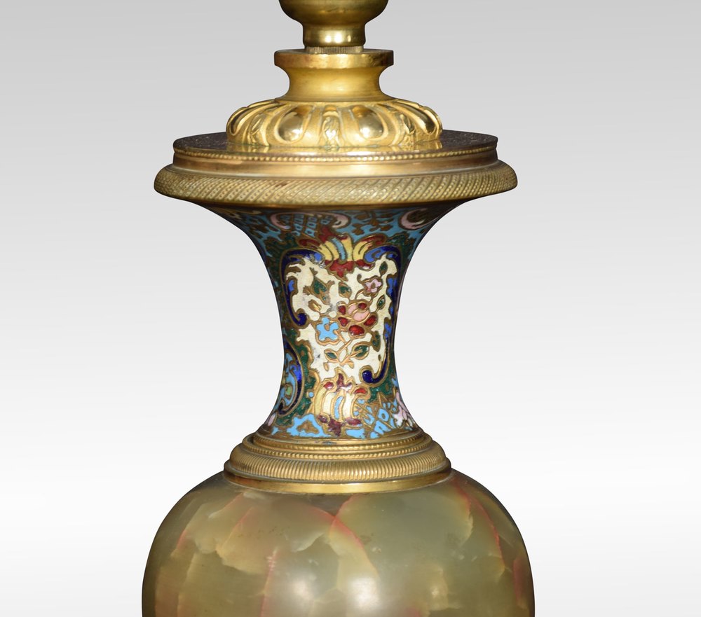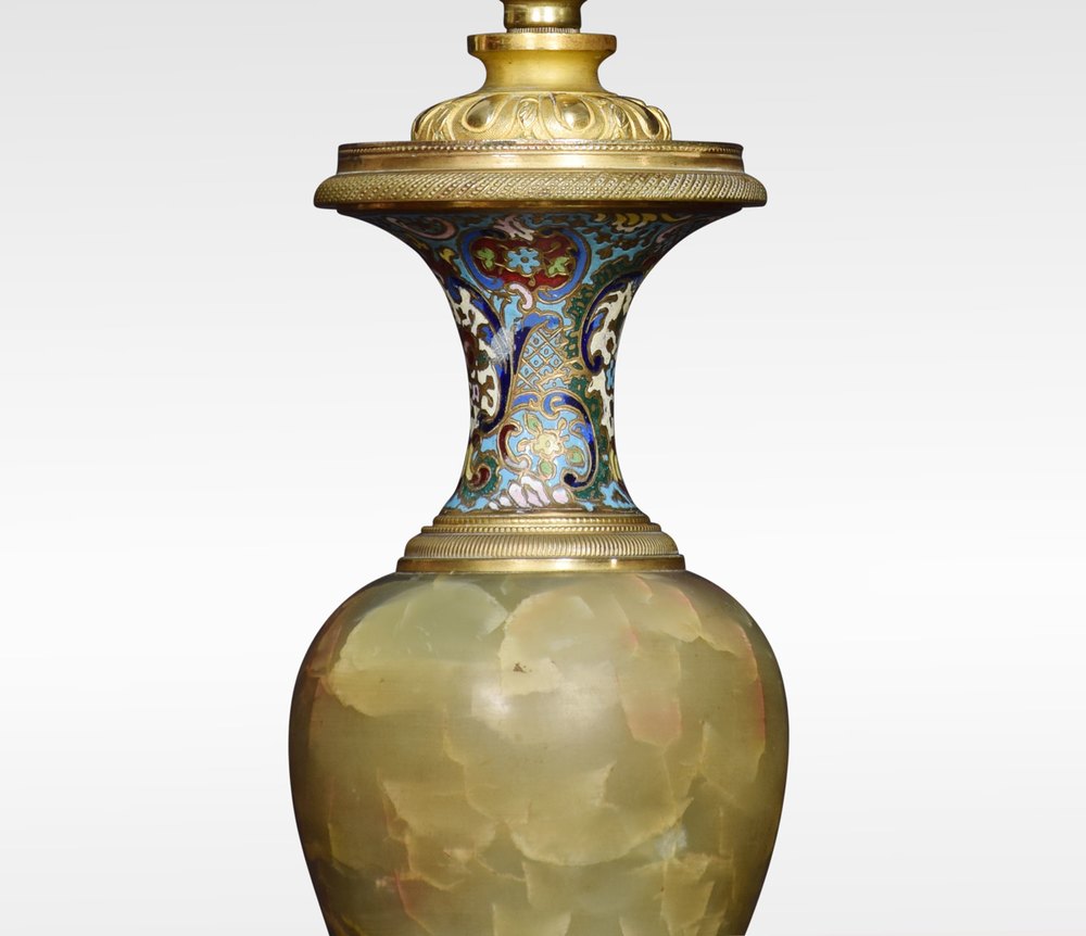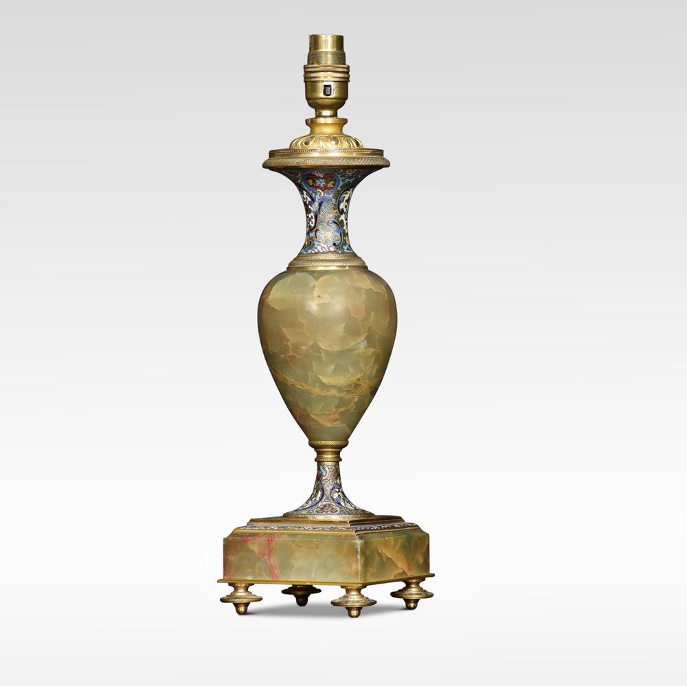 An onyx and champlevé table lamp, of baluster form, raised square base terminating in toupee feet.
