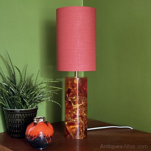 'Shattaline' was an English company which patented a process to create 'shattered' resin, giving it a beautiful 3 dimensional pattern which glitters in the light, particularly when the lamp is lit. Lamps were one of the most popular items made from the resin, along with paperweights and other decorative items.