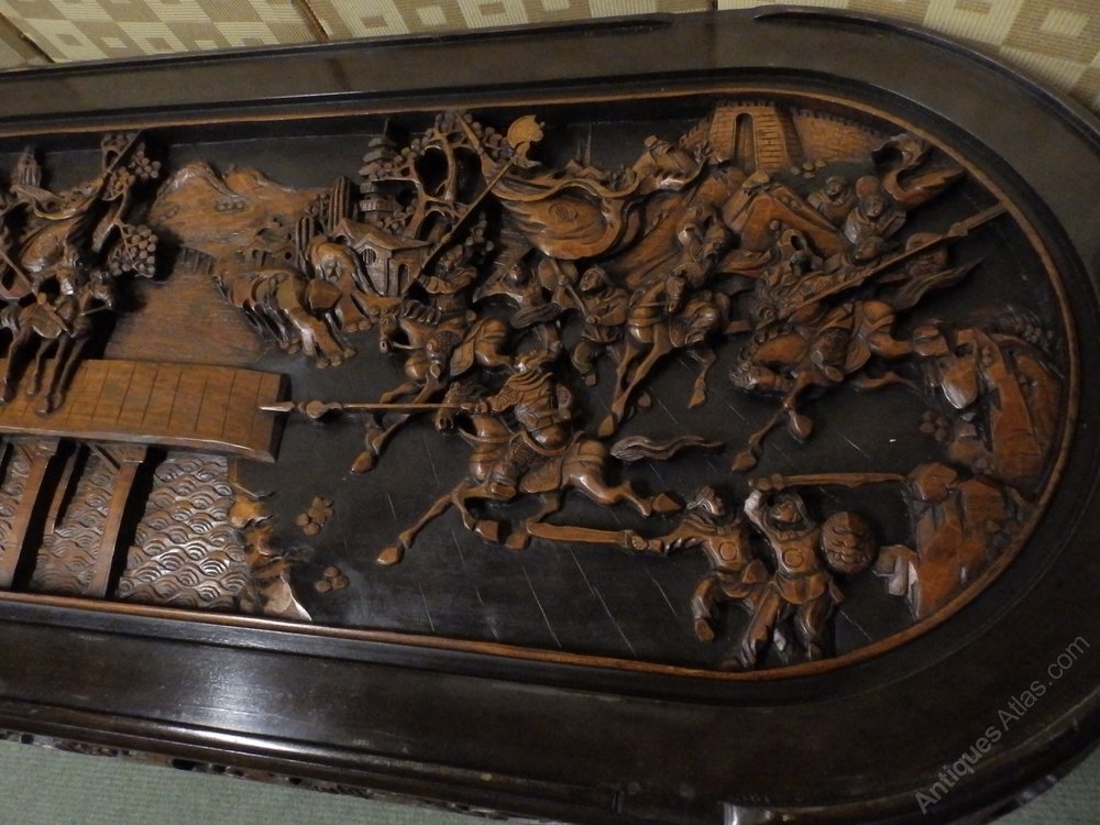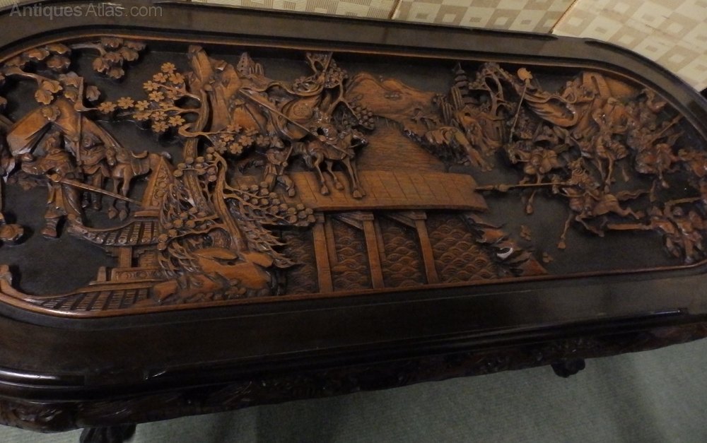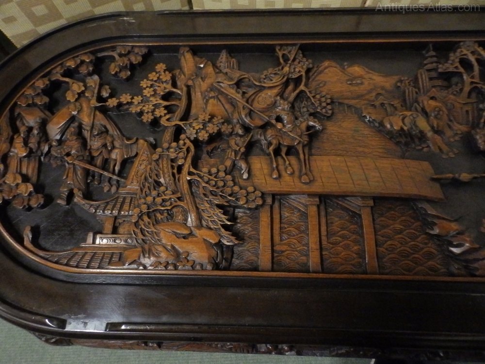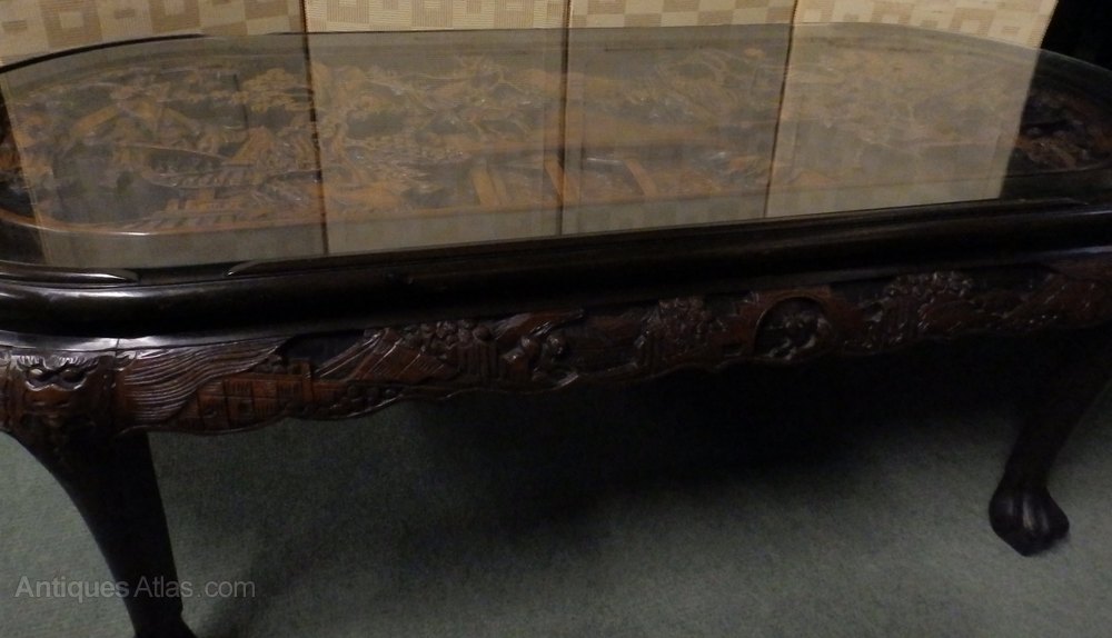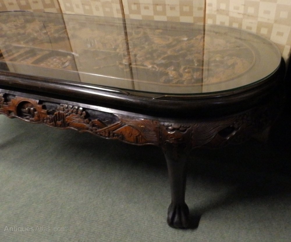 no-13-1960s very large Oriental heavily carved low table with glass protector in very good condition