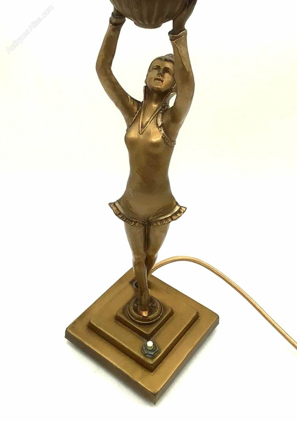 This striking, authentic Art Deco lamp from the 1930s features a graceful female figure, beautifully gilt over spelter and poised atop a square stepped base. The sculpture captures the elegance and movement characteristic of the era, making it a captivating centrepiece for any collection.