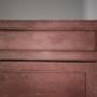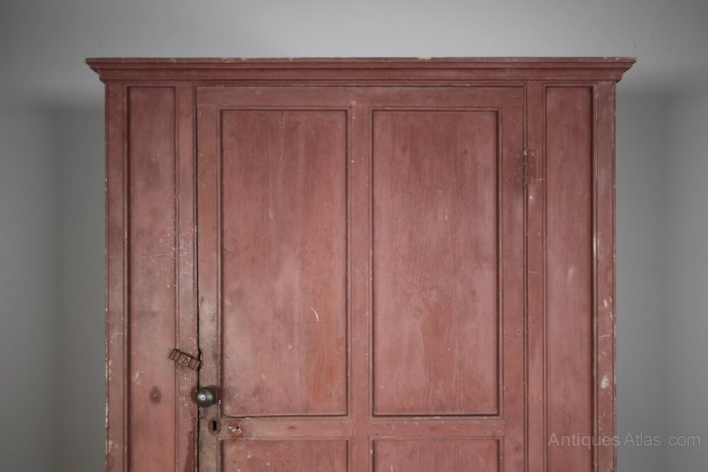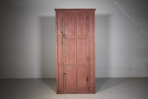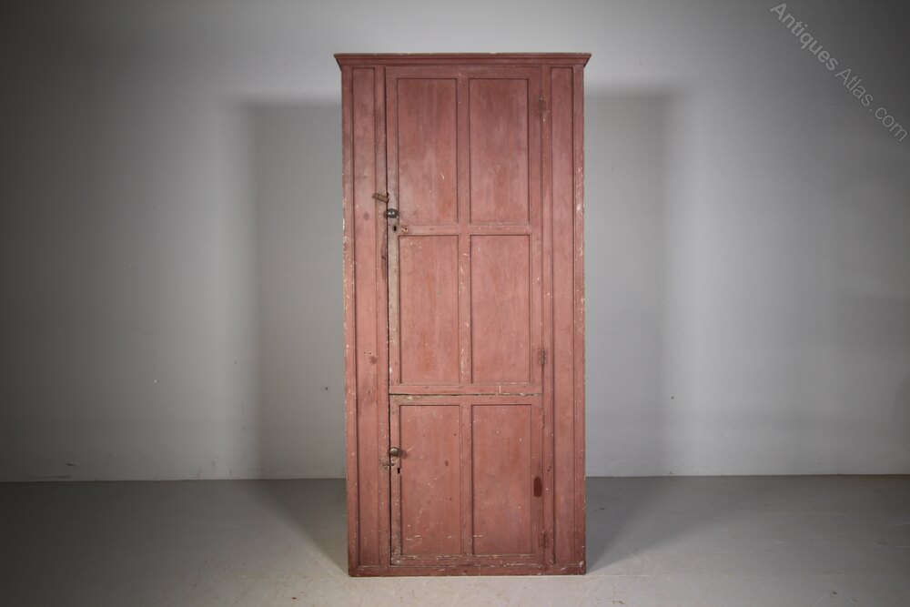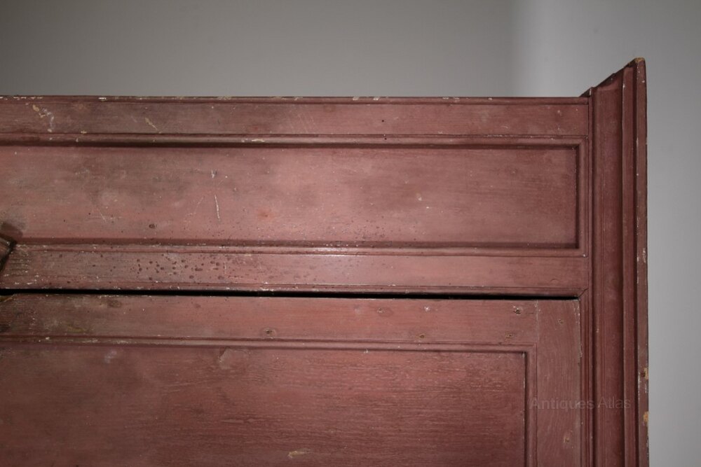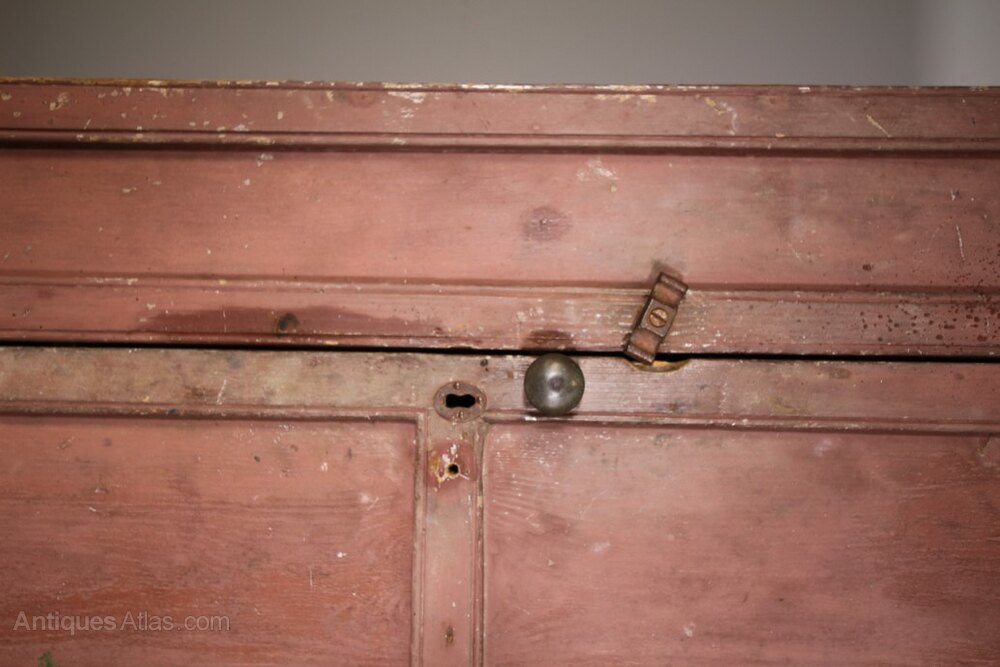 A wonderful English early 19th century antique painted pine kitchen cupboard that is still in it’s lovely original pinky red paint finish. Made in one section in yellow pine, this antique kitchen cupboard has a well panelled long door that has original brass knob handles and to each side of the cupboard doors are panelled. Inside are the original storage shelves and the inside of the door has old green paint. To the top of the cupboard is a neat, moulded cornice. So lovely to find an English original painted pine antique food cupboard still in its intended paint colour, dates to around 1820.