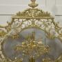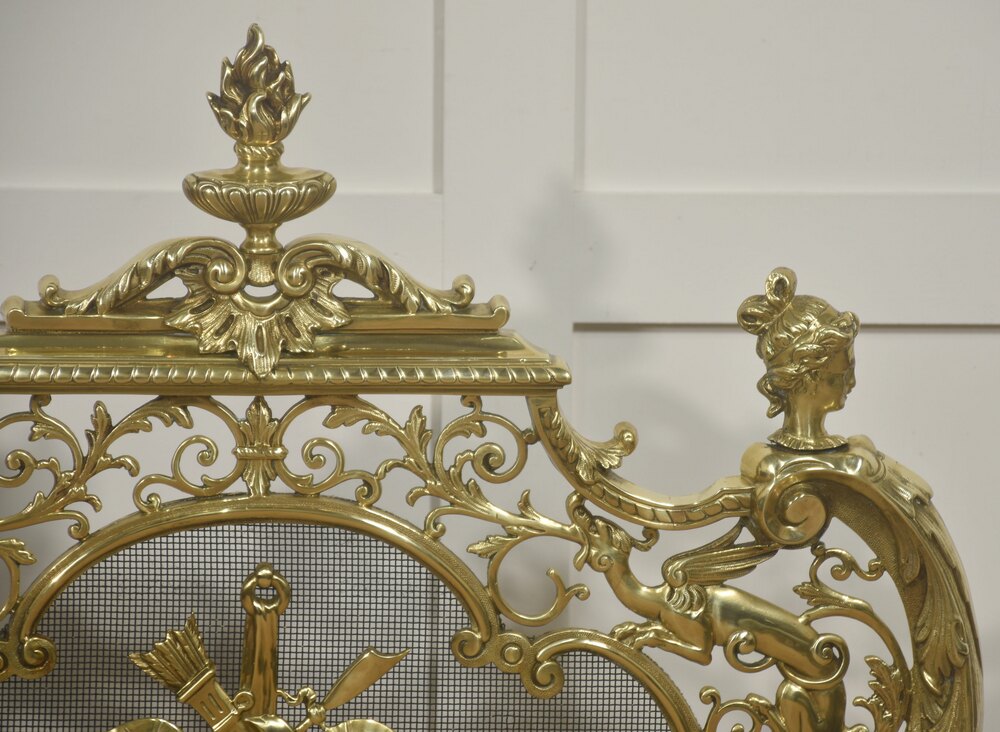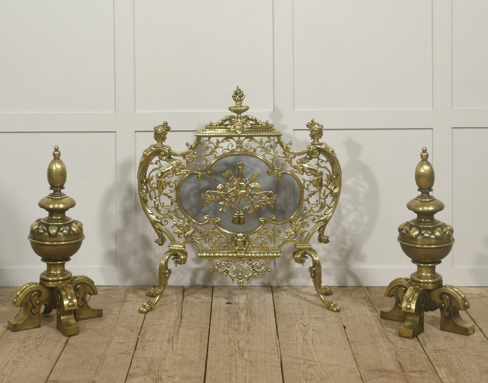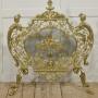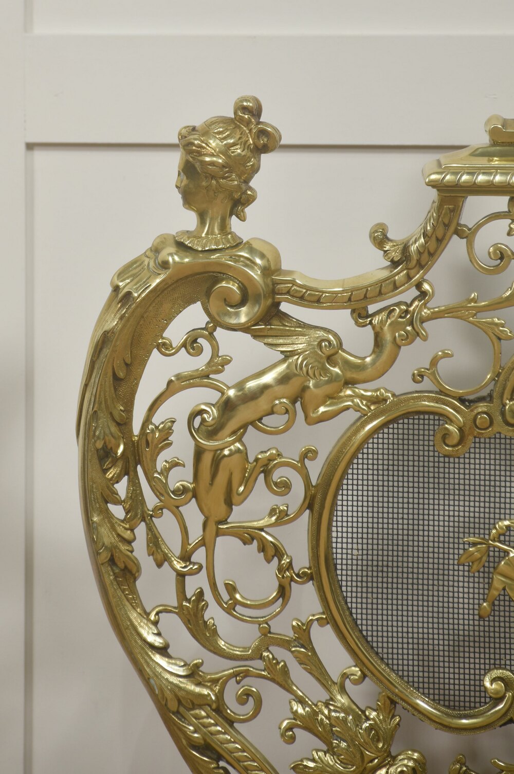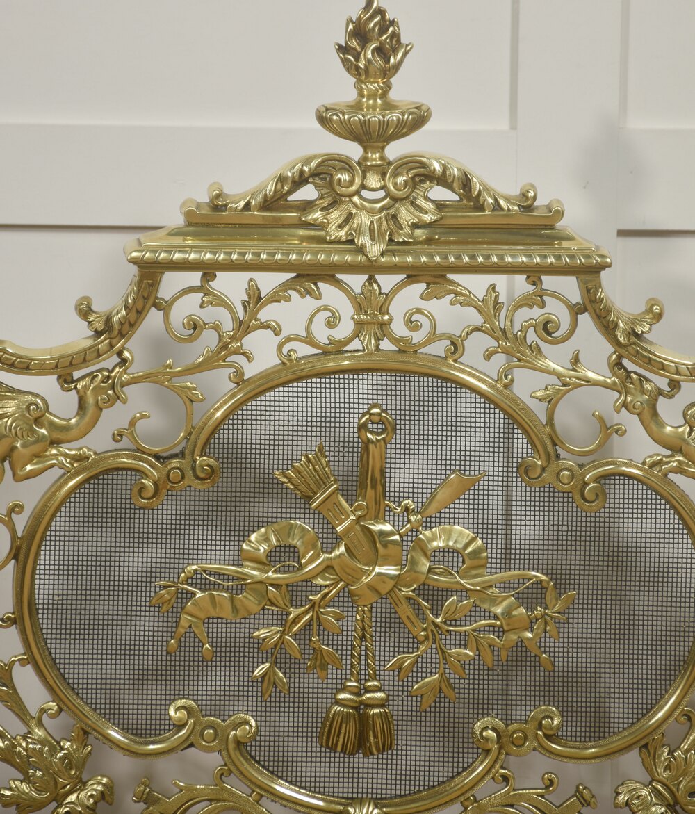 An exceptionally ornate brass fire screen in the Louis XVI taste, conceived as both a functional hearth accessory and an object of high decorative ambition. The architectural superstructure is crowned by a flaming finial rising from a lobed urn, centered above an intricately pierced cresting of scrolling acanthus and laurel ornament. The frame is executed in openwork throughout, with finely cast and chased foliate scrolls that create a light yet visually complex silhouette.