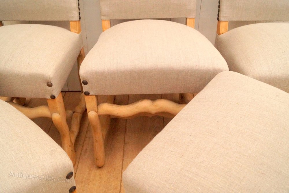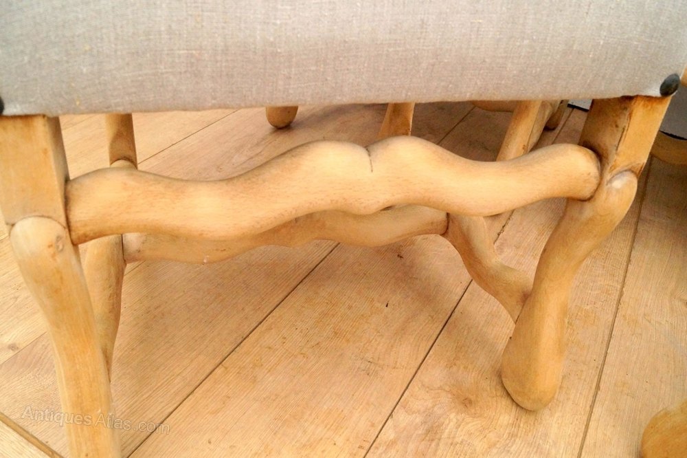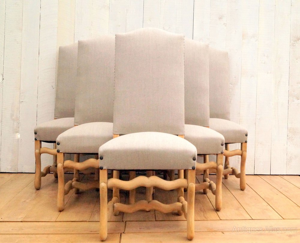 A set of six mid century Os De Mouton French dining chairs. Bleached oak frame and reupholstered in pale linen.