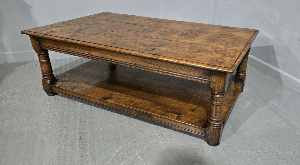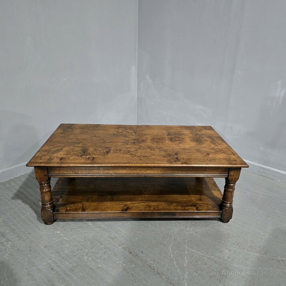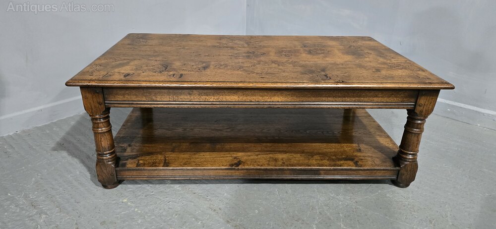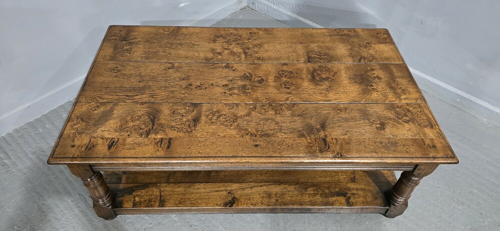 A stunning burr oak three plank coffee table with plank undertier, in excellent overall condition.