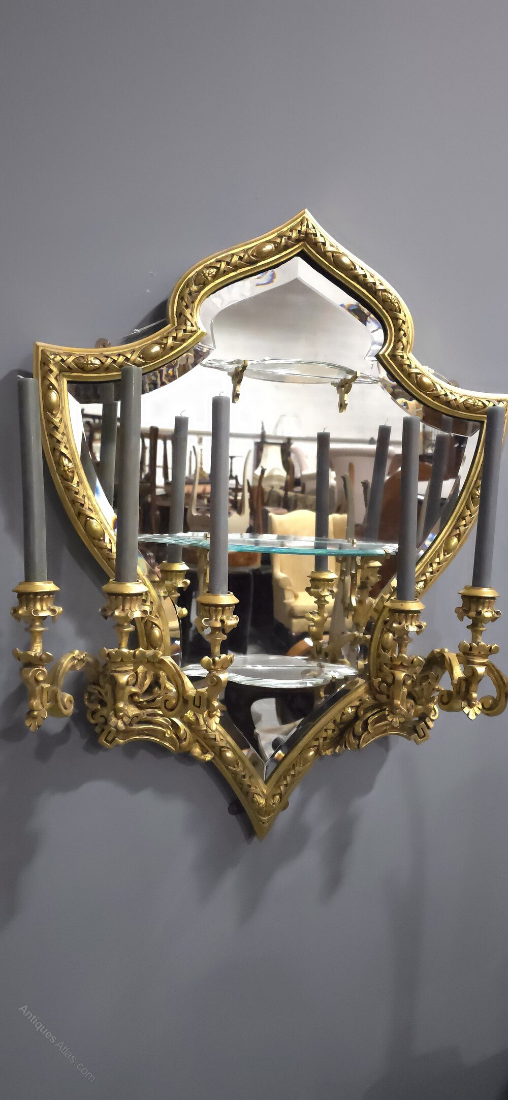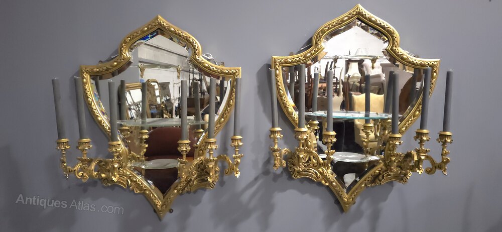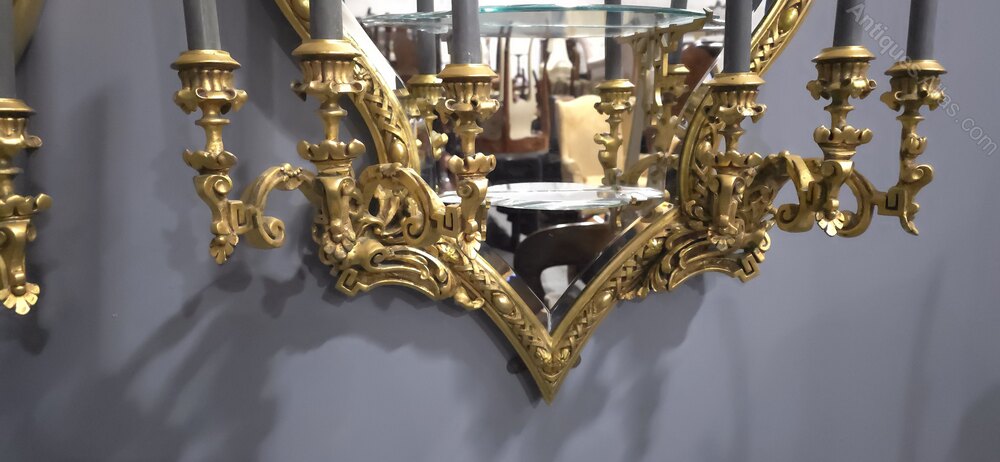 A superb pair of continental bevelled mirror gilded girondole wall mirrors, in outstanding condition each having three cut glass shelves with brass brackets, six candle holders on each mirror, shield shaped with a moorish taste to the tops.
