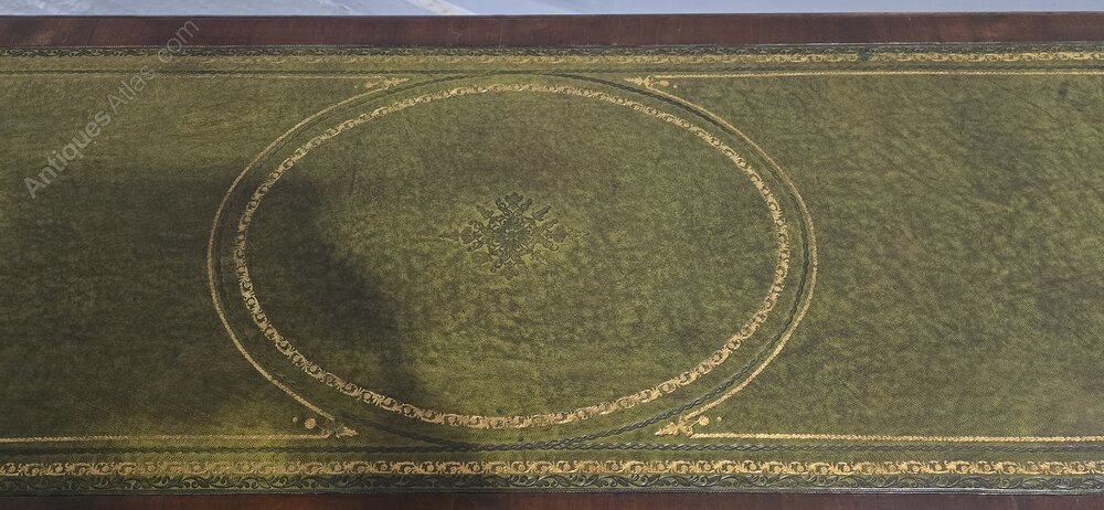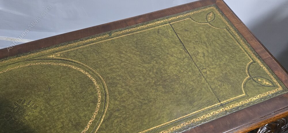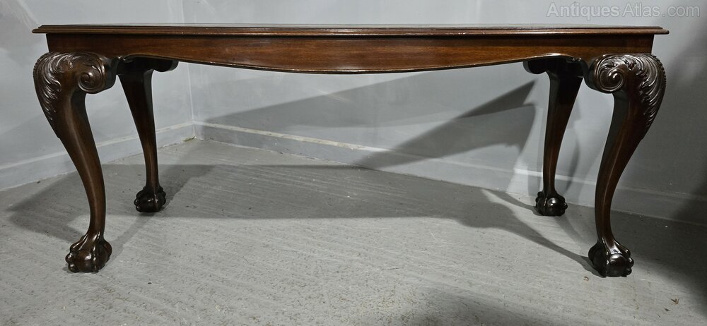 Excellent quality Chippendale style mahogany sofa console, standing on heavy ball and claw carved legs, and wonderful green tooled leather top, in excellent overall condition.