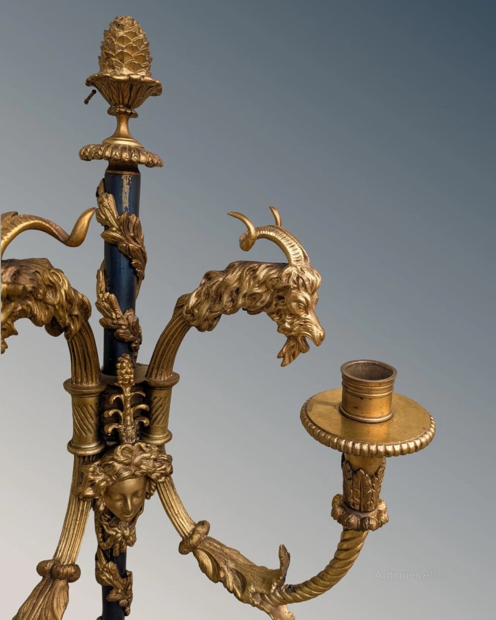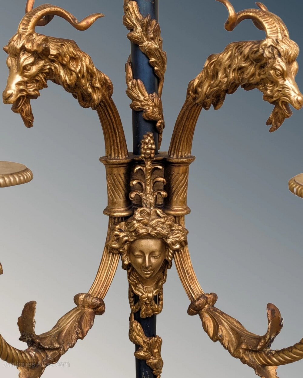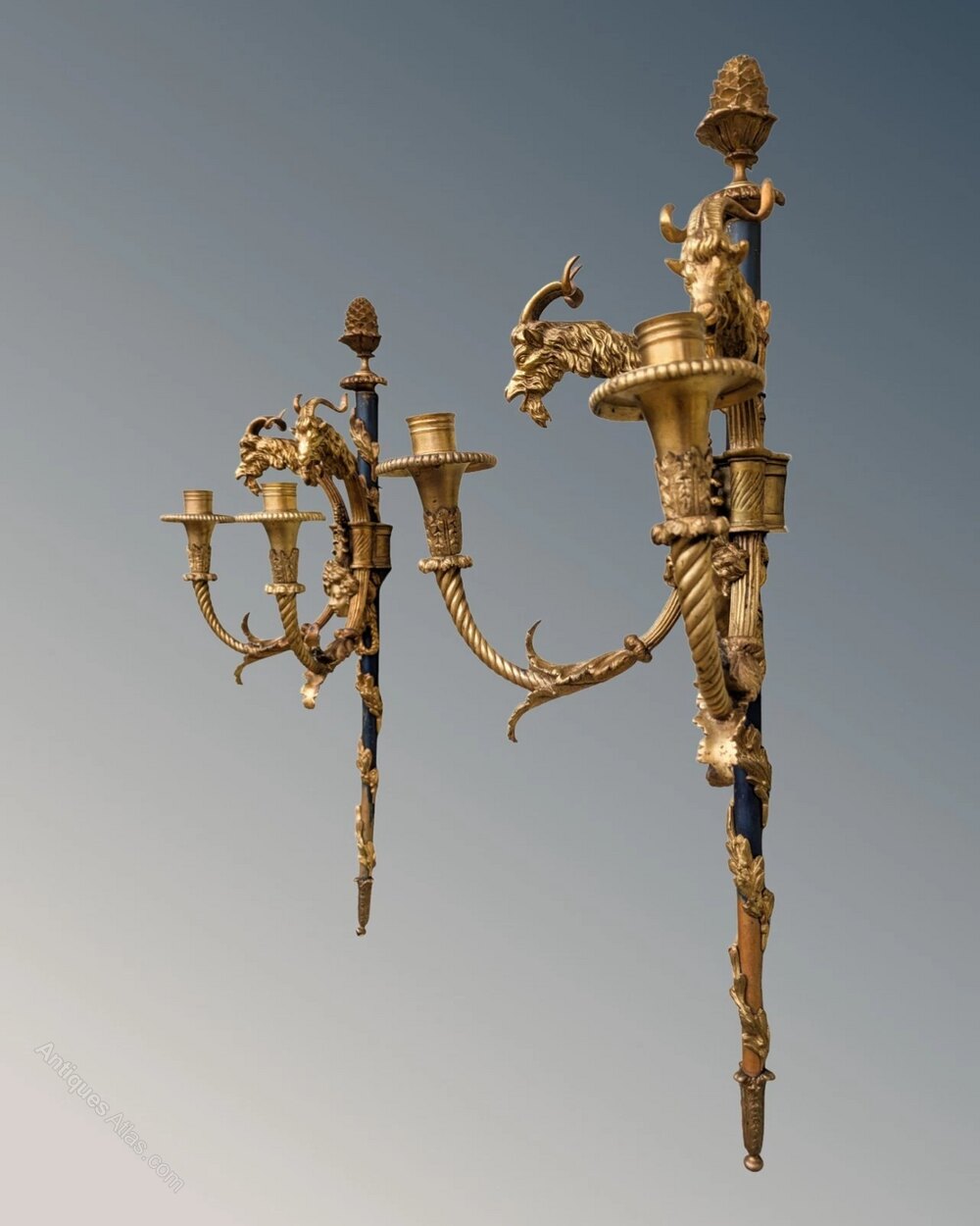 The pair have central masks and wonderful bearded goat heads with long curled horns as well as a fine bronze pineapple finial.