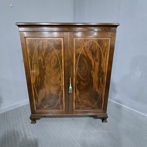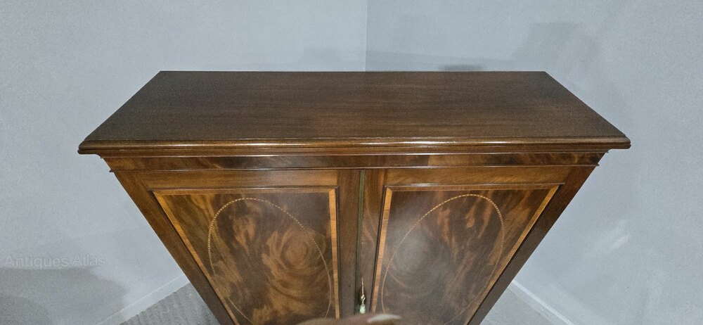 A superb Victorian double door with stunning flame mahogany and inlaid panels, Library bookcase, with three adjustable mahogany shelves,standing on ogee braket feet, in excellent overall condition.