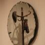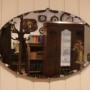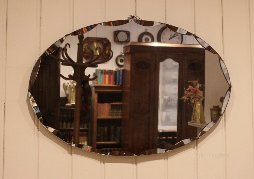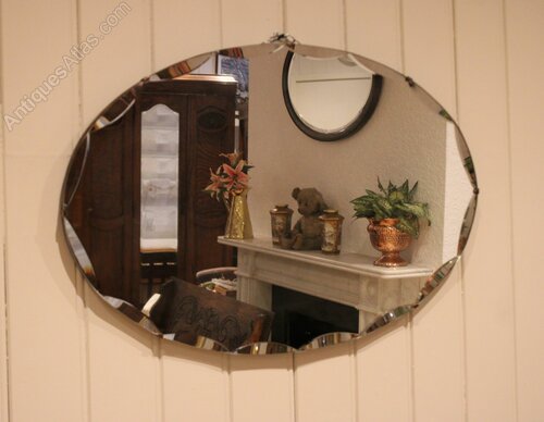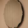 Oval frameless cut glass wall mirror having bevelled and etched edges .