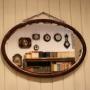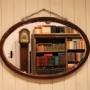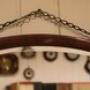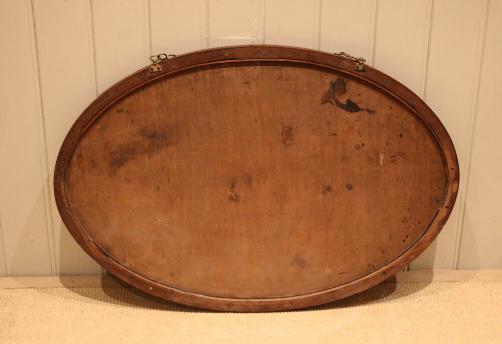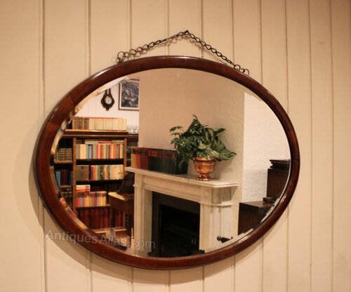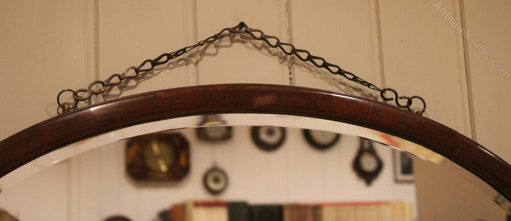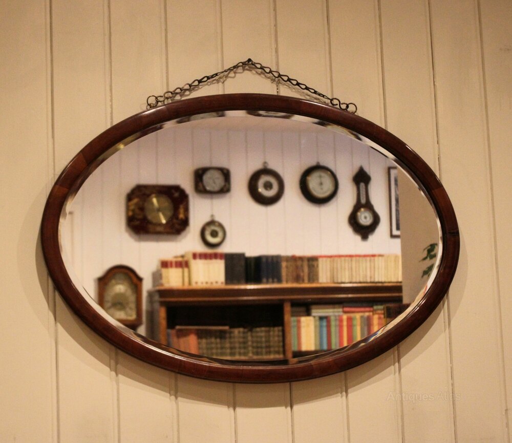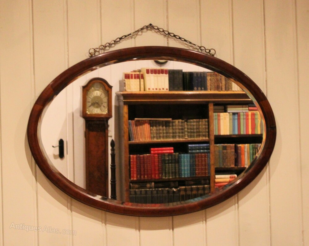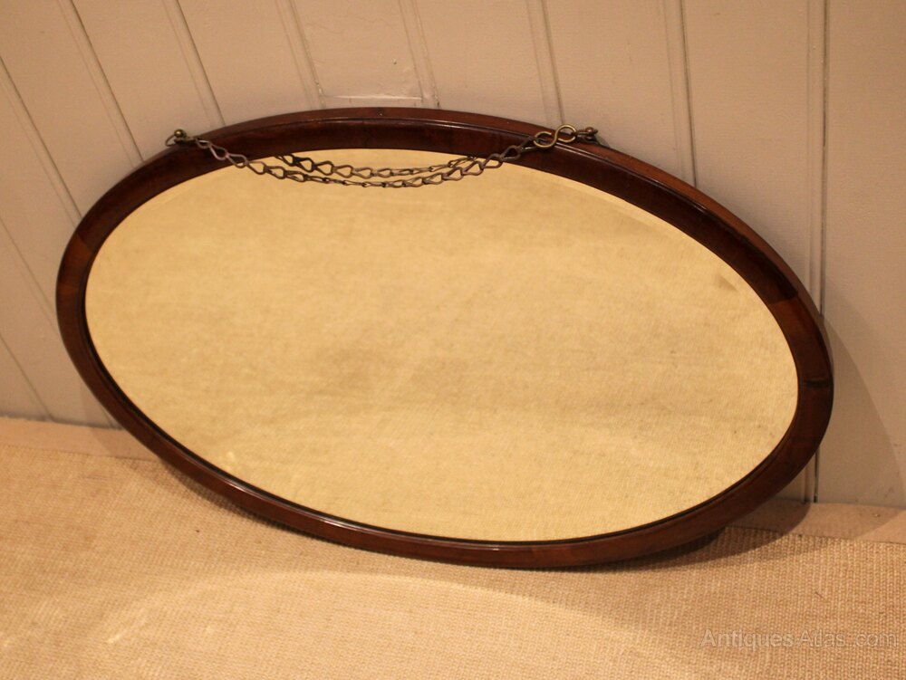 Oval walnut wall mirror having bevel edge glass in an oval walnut frame . The height including the chain is 66 cm .