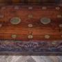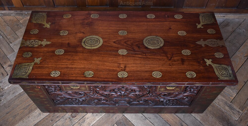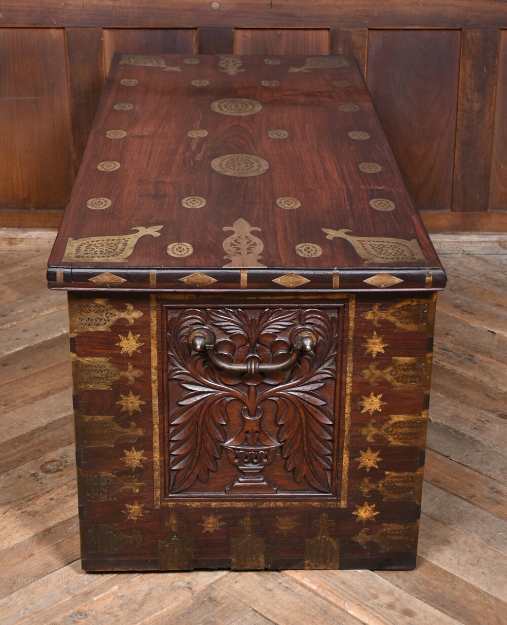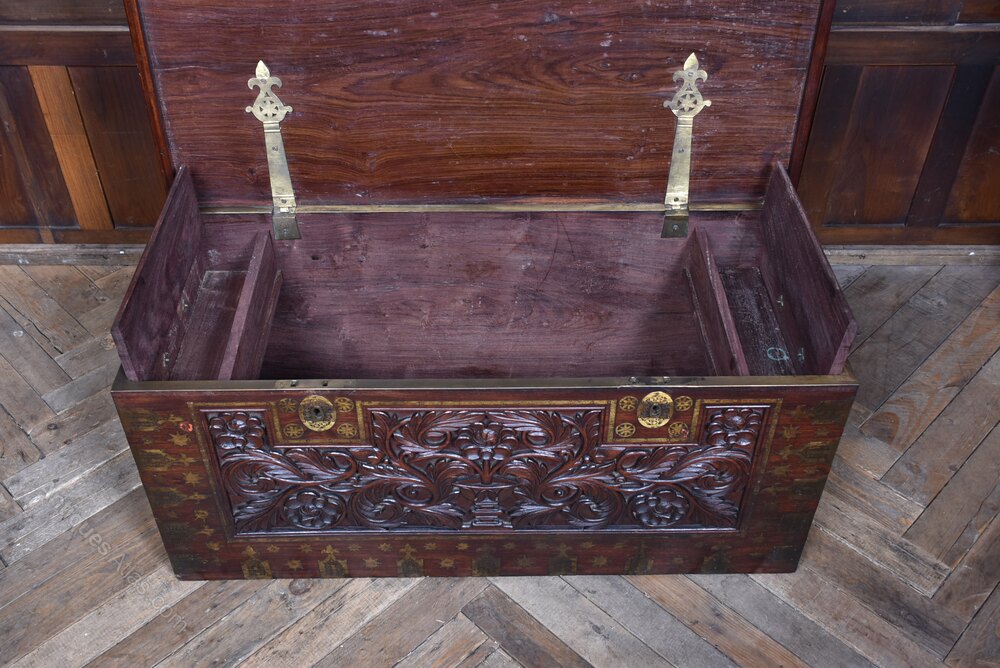 The front and sides boast deeply carved floral panels, while the back features a simpler carved design, all framed by additional brass inlay. This elegant piece is perfect for storing blankets, pillows, or cherished belongings at the foot of a bed. Alternatively, its warm colour and exquisite carving make it an eye-catching coffee table that deserves pride of place in any living space.