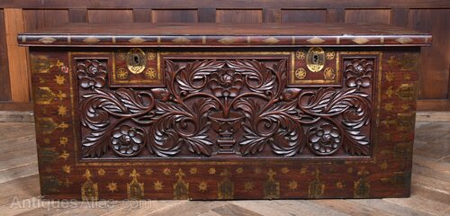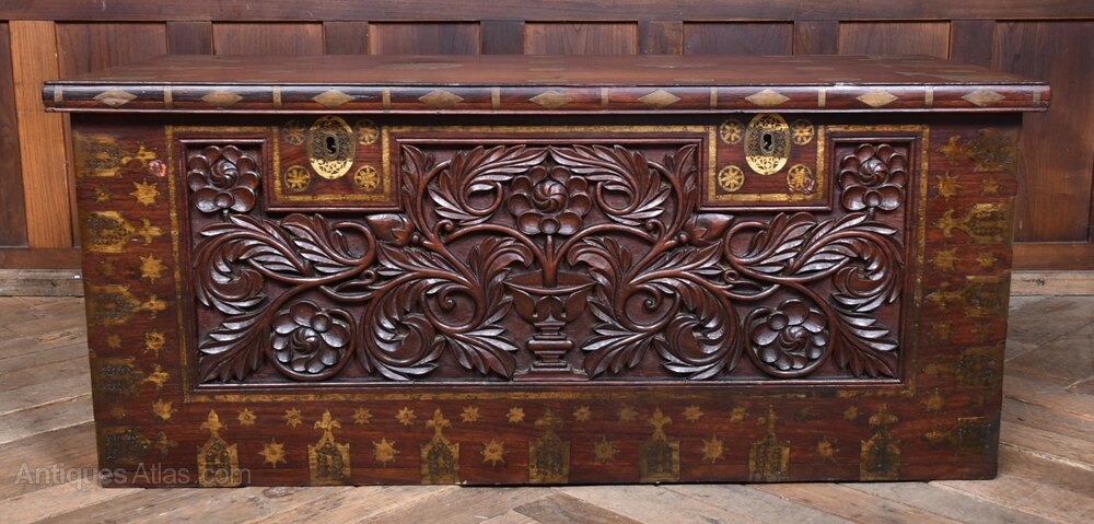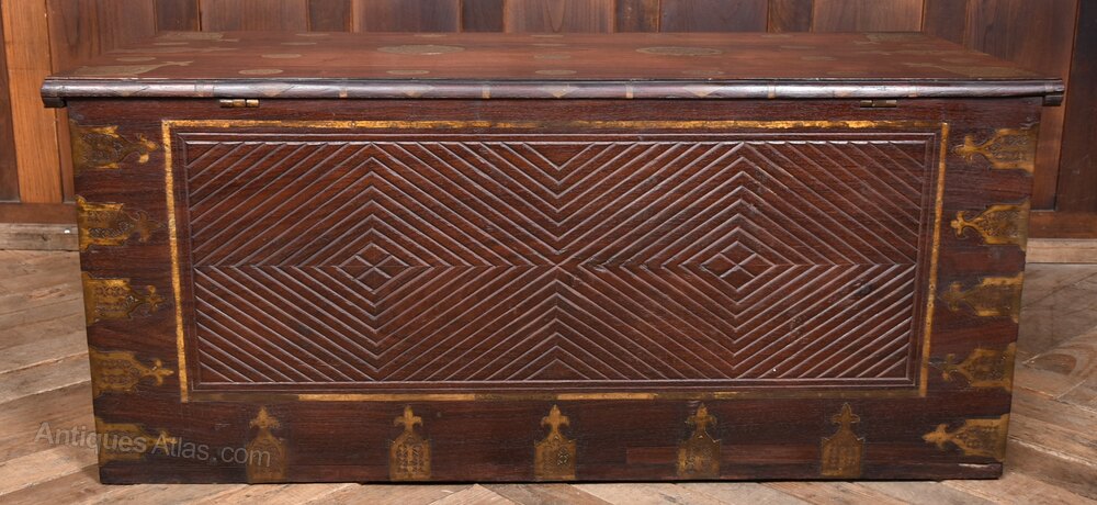 This superb Padouk blanket box is a stunning example of antique craftsmanship, presented in wonderful condition. The richly decorated top features intricate brass inlays and lifts to reveal a pristine interior, complete with its original candle boxes and decorative brass hinges.