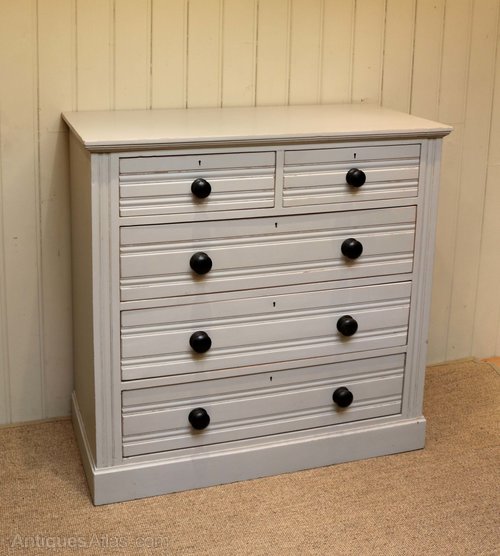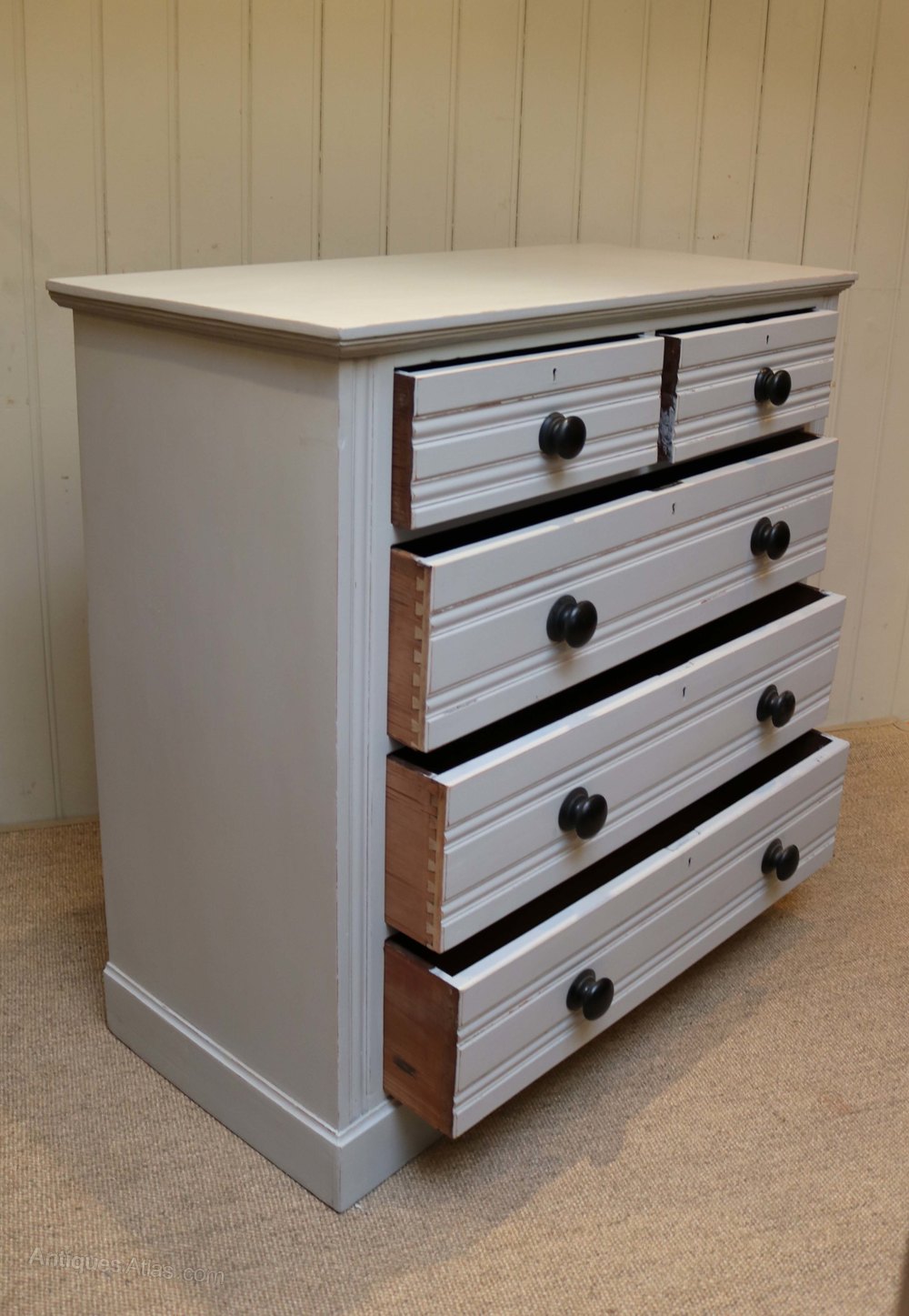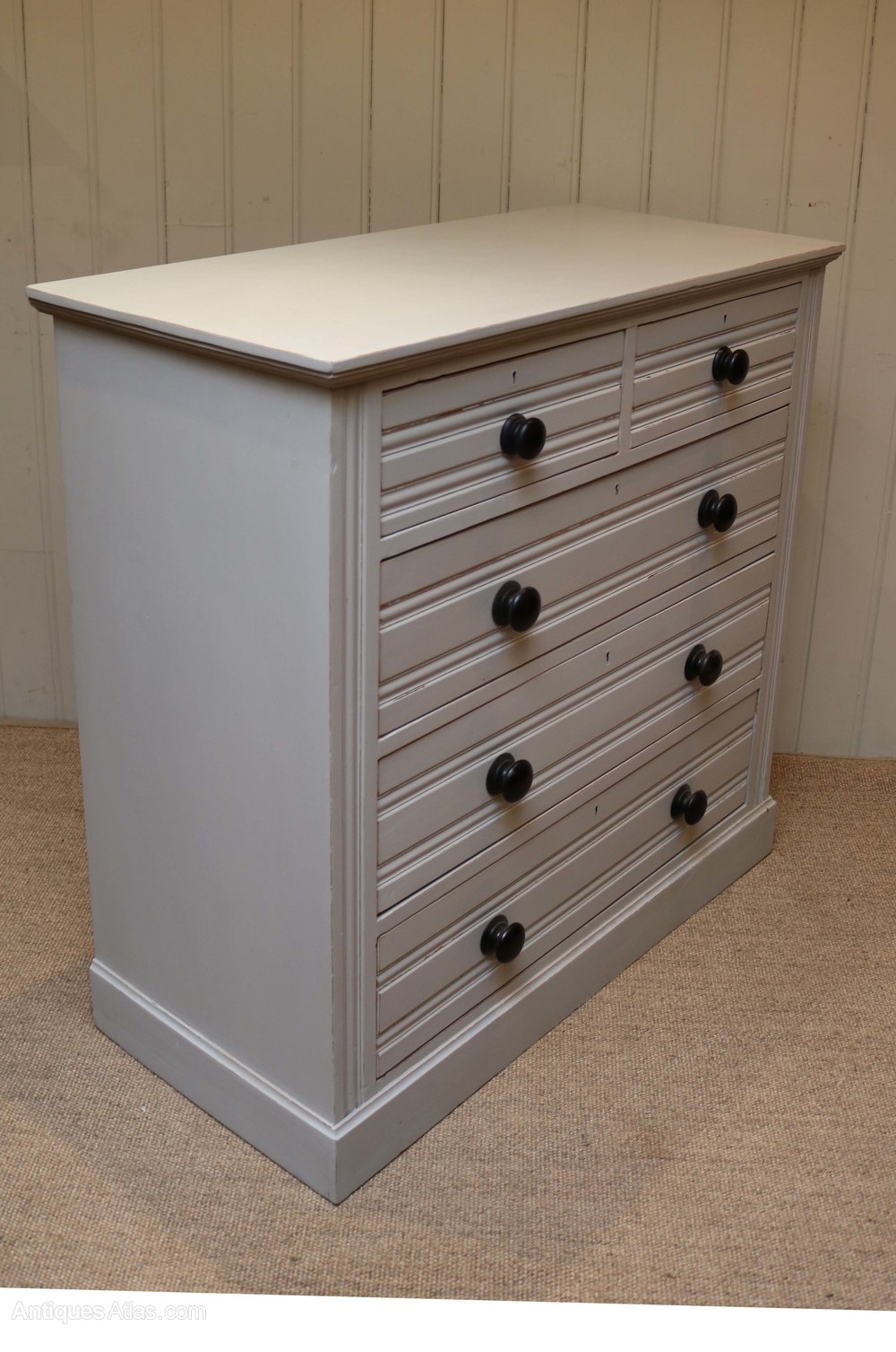 Painted pine chest of drawers having two short and three long reeded drawers with turned wooden handles raised on a plinth base