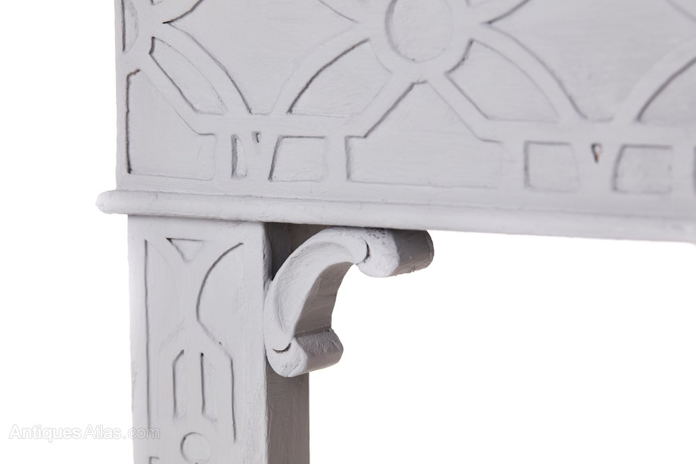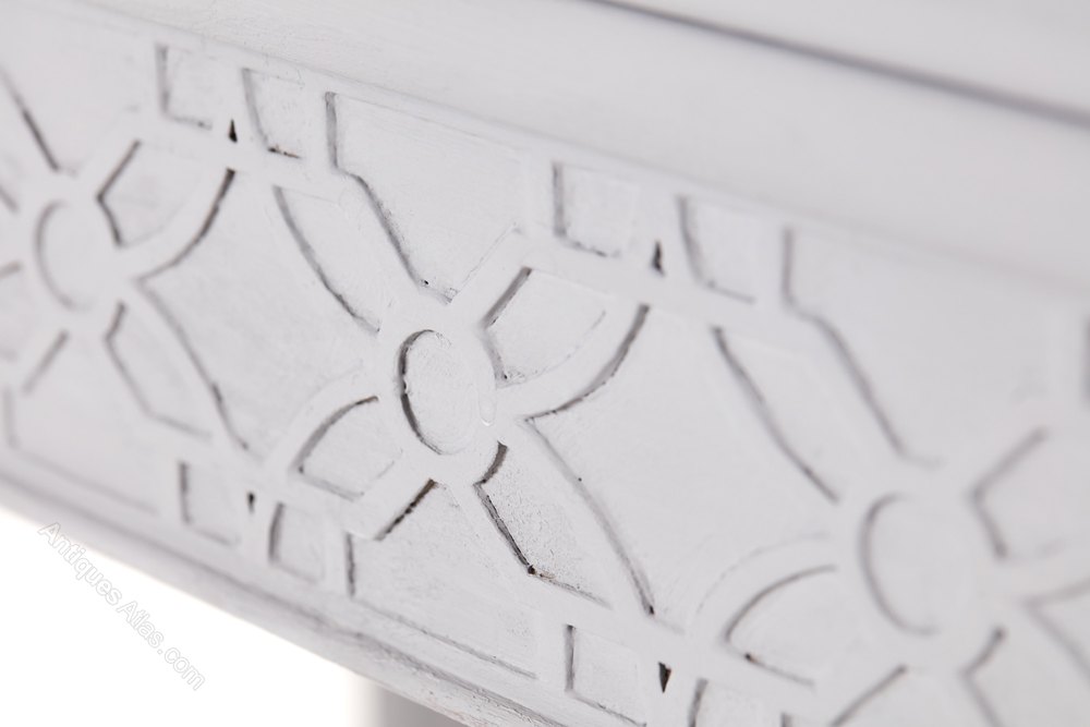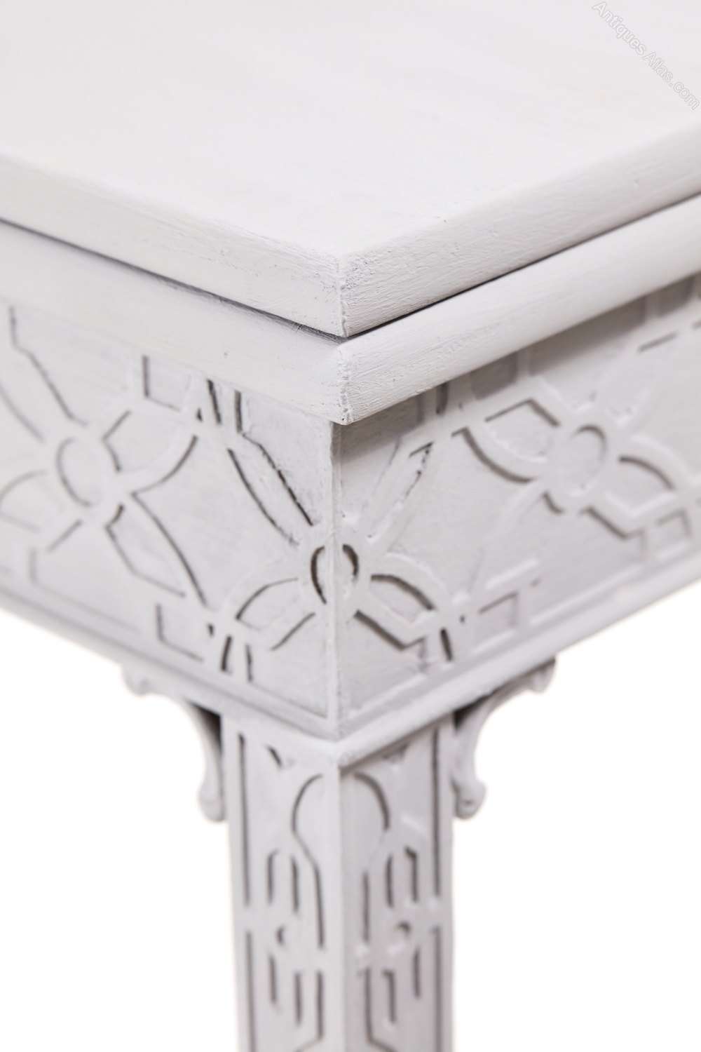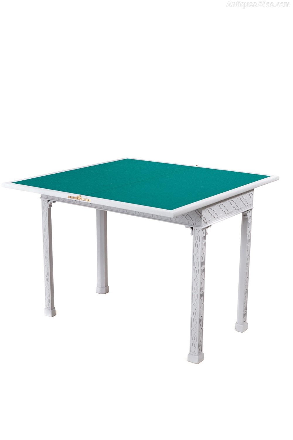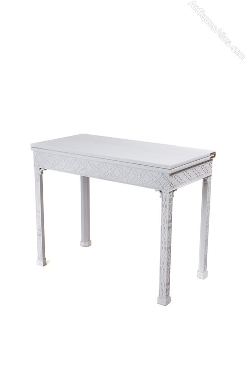 Painted chippendale style card table,the top swivels and lifts to reveal a baize interior,blind fretwork to the frieze,standing on four square chamfered legs with blind fretwork