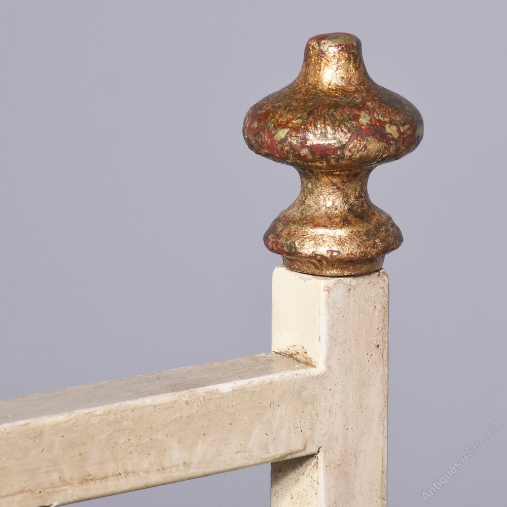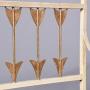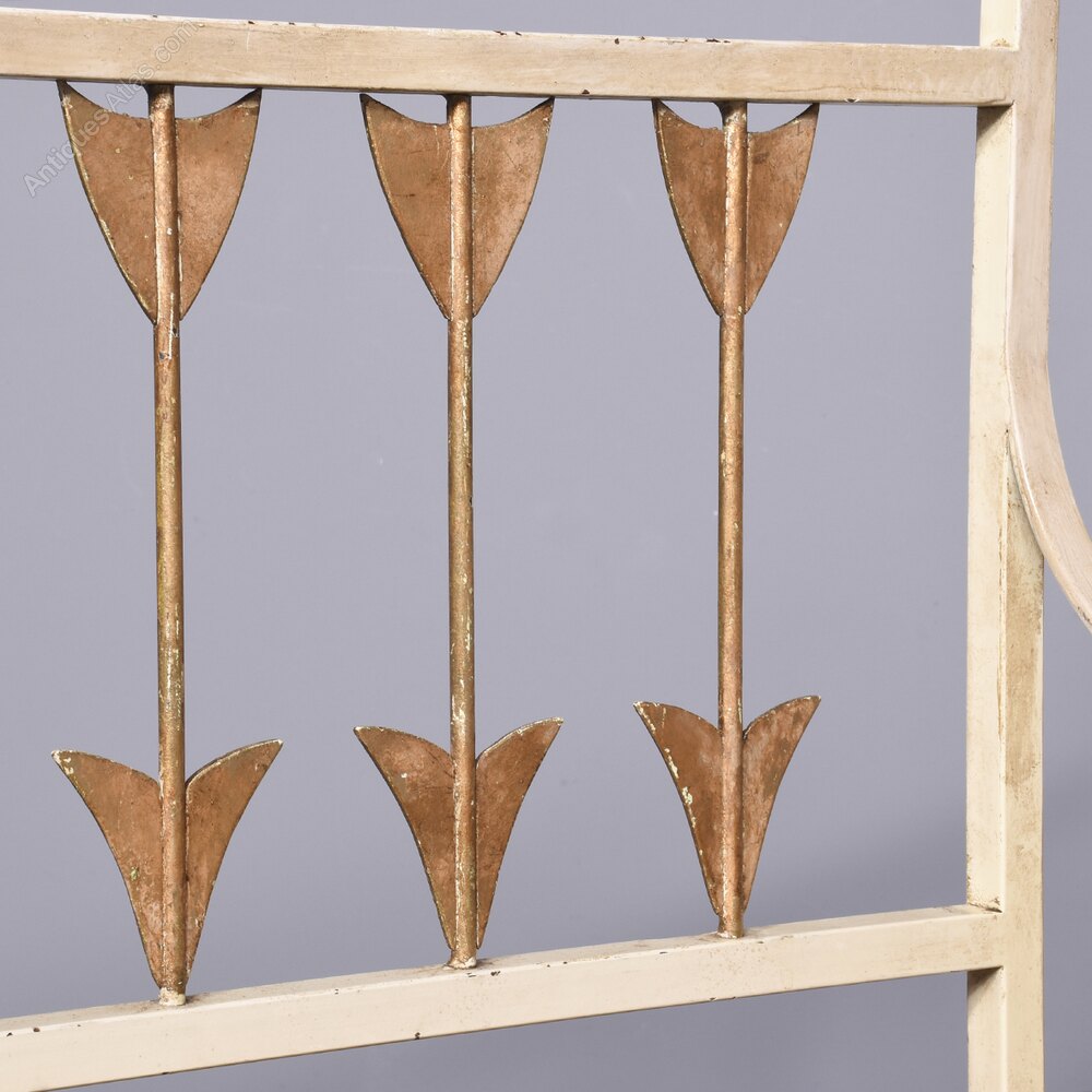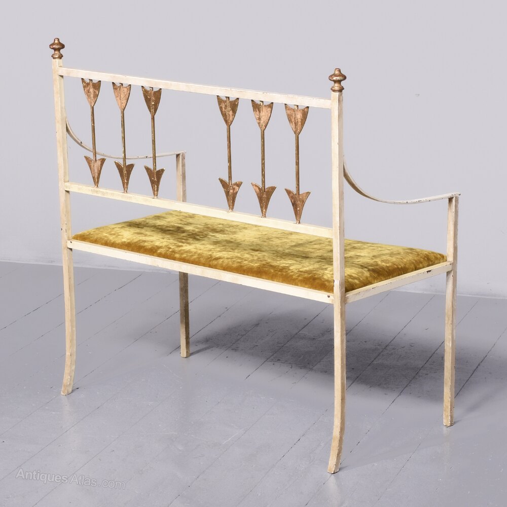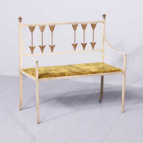 Circa 1970s. An interesting and stylish Italian metal, upholstered and painted hall bench. The top with a simple rail, with gilded finials, the back with six metal arrows, upholstered seat with two simple shaped arms supported on rectangular uprights, back legs are slightly out swept, with square front legs. The arrows and finials are gilded and the rest of the bench is in off white.