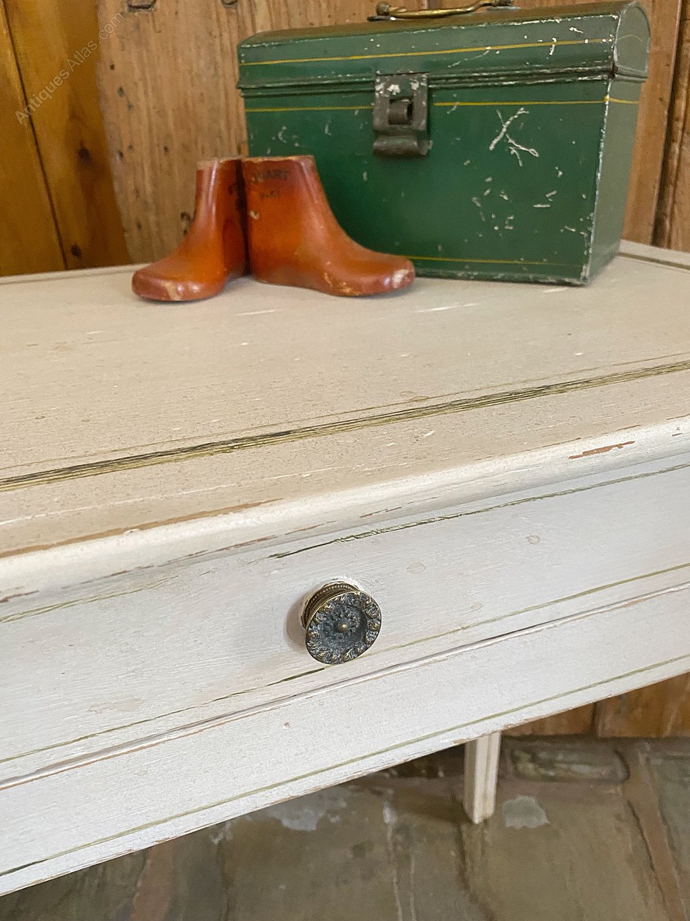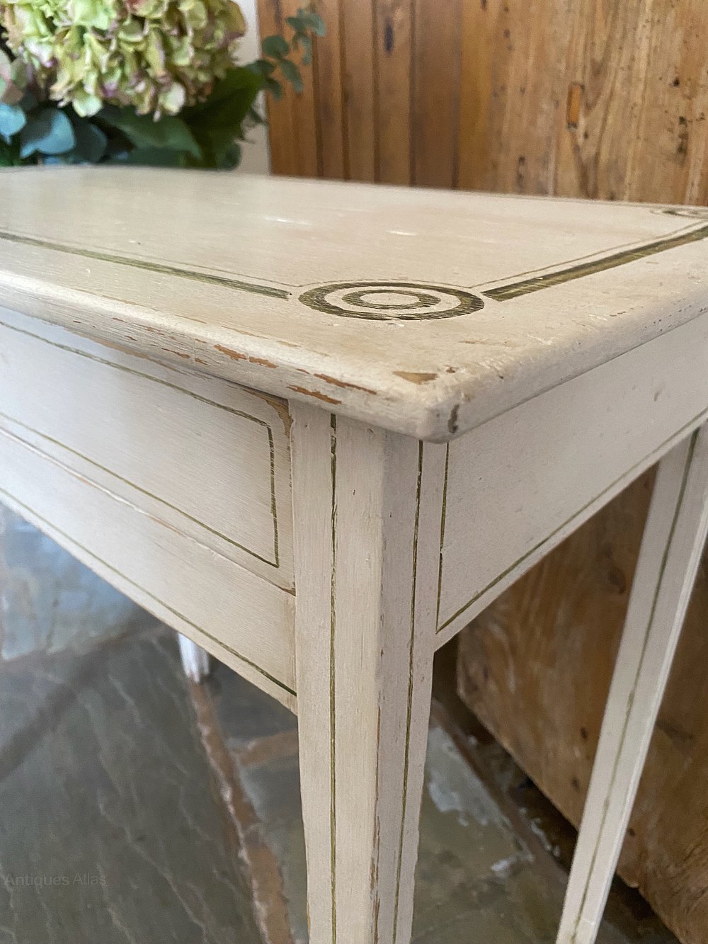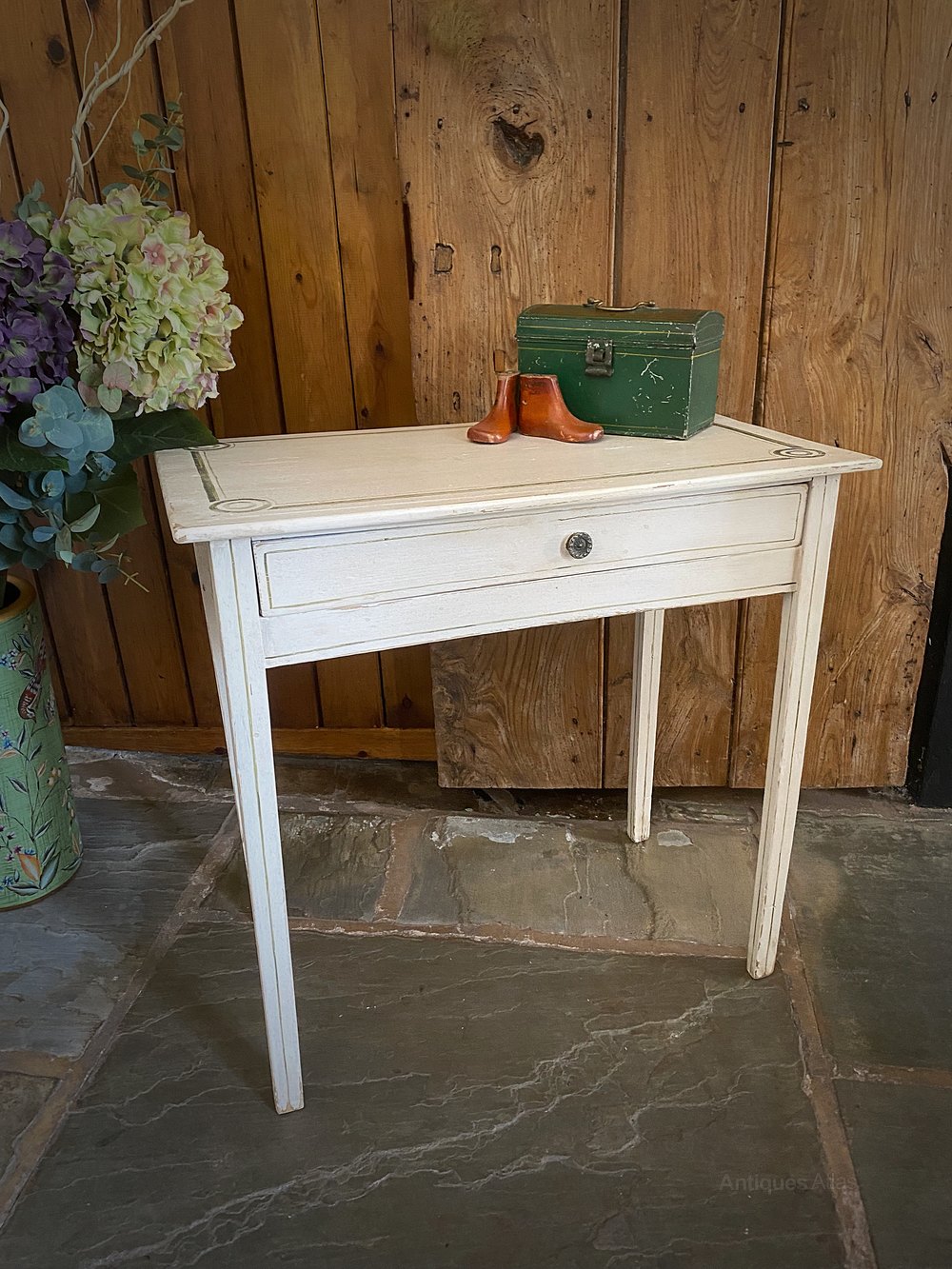 Re-finished in an off white with traditional line and roundel designs in two shades of green. Distressed and waxed to produce a great time worn look.