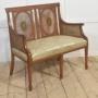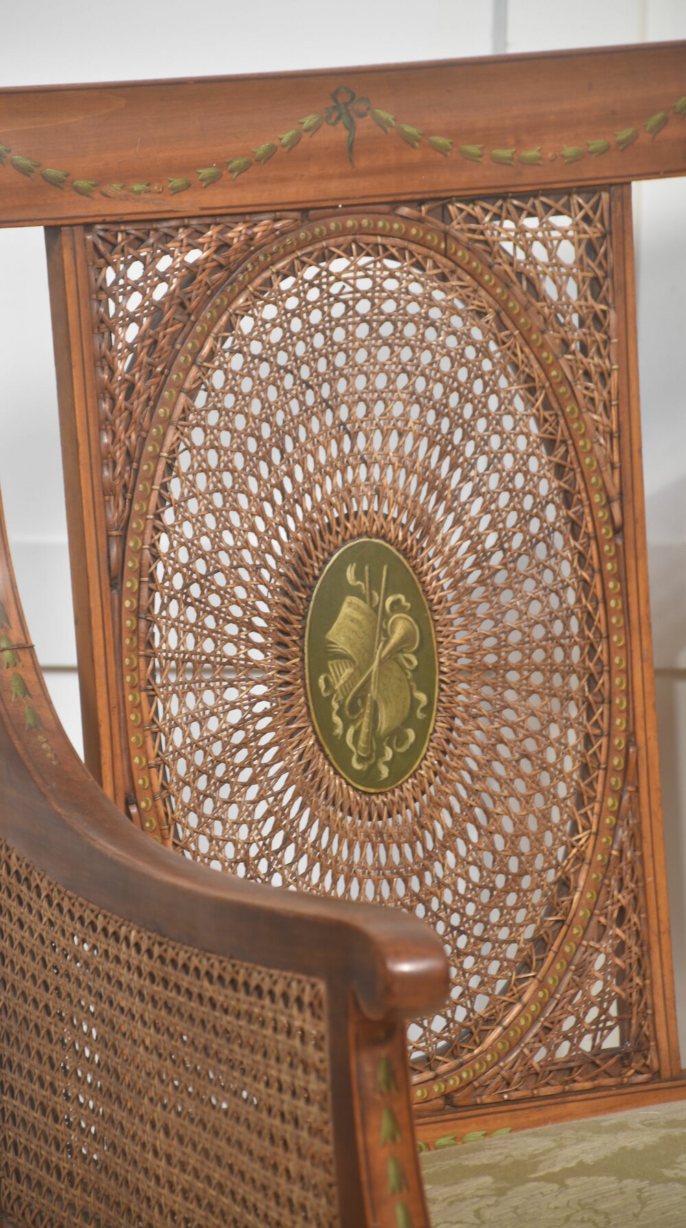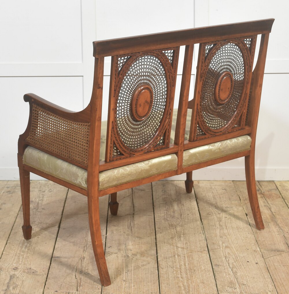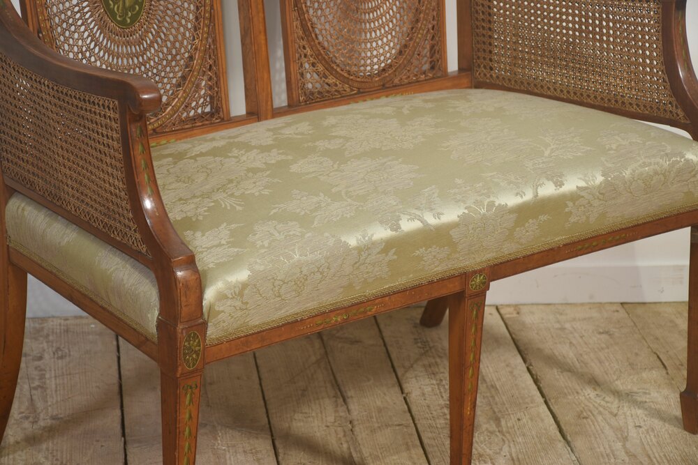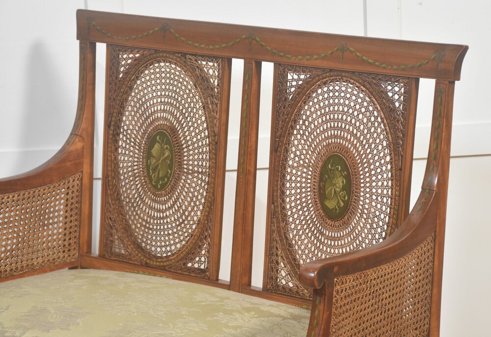 An elegant English settee in the Regency taste, constructed in satinwood and finely detailed throughout. The gently curved arms and rectangular back are infilled with finely woven cane panels, the back centred by twin oval medallions framed in concentric cane work. The frieze and legs are enriched with delicate green-painted neoclassical ornament, including husk swags, ribbons, and rosettes, all retaining good definition. The seat is upholstered in a pale green damask, complementary to the painted decoration. Raised on tapering square legs with further painted detail. A refined and well-proportioned example, combining lightness of form with high-quality craftsmanship.