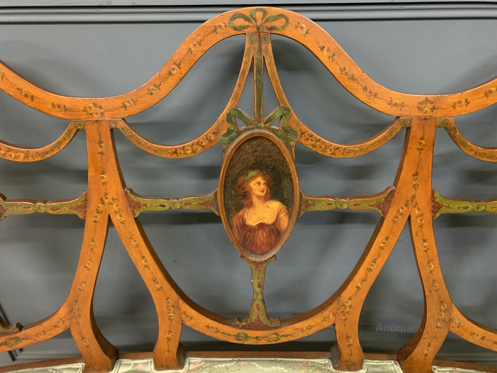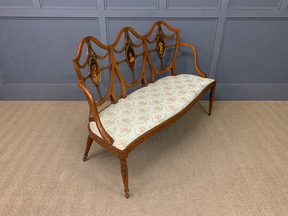 A lovely Edwardian period painted satinwood settee. Very constructed in solid satinwood and decorated with painted detailing throughout. With floral swags and garlands and central neo-classical cameo portraits. With a triple shield back and out-swept arms. Standing on turned , tapering, legs. Well upholstered in a floral fabric. Offered for sale in very good original condition.