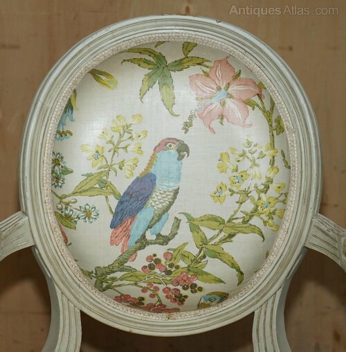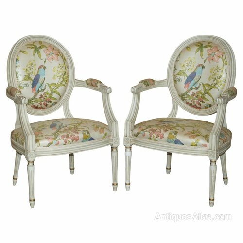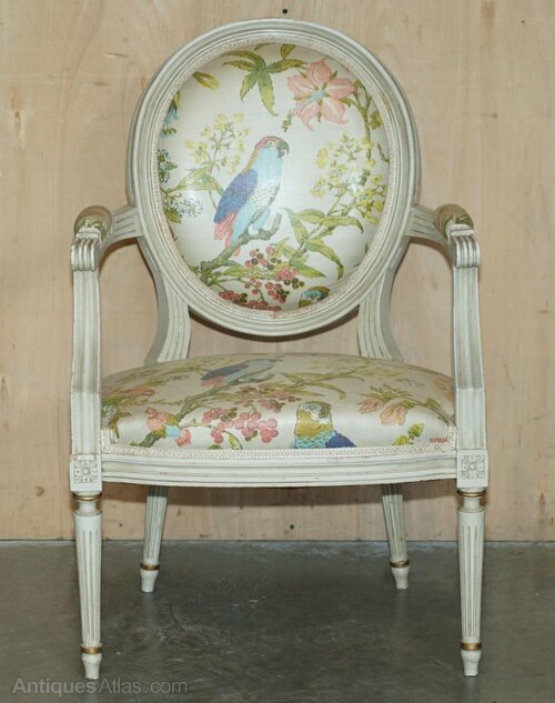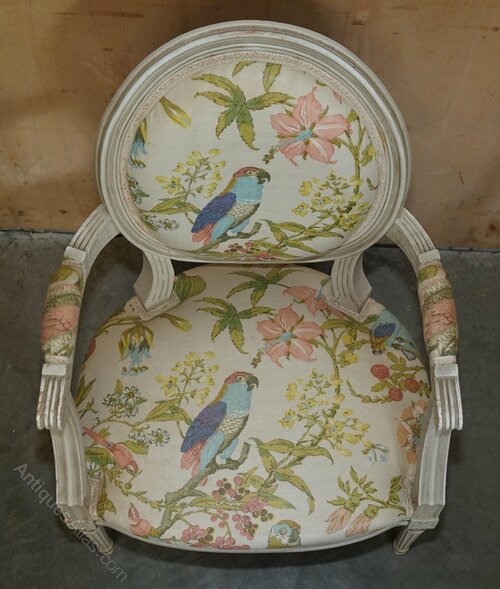 A very good looking well made and decorative pair of armchairs, the upholstery is vintage and depicts Parrots in a garden scene as you can see