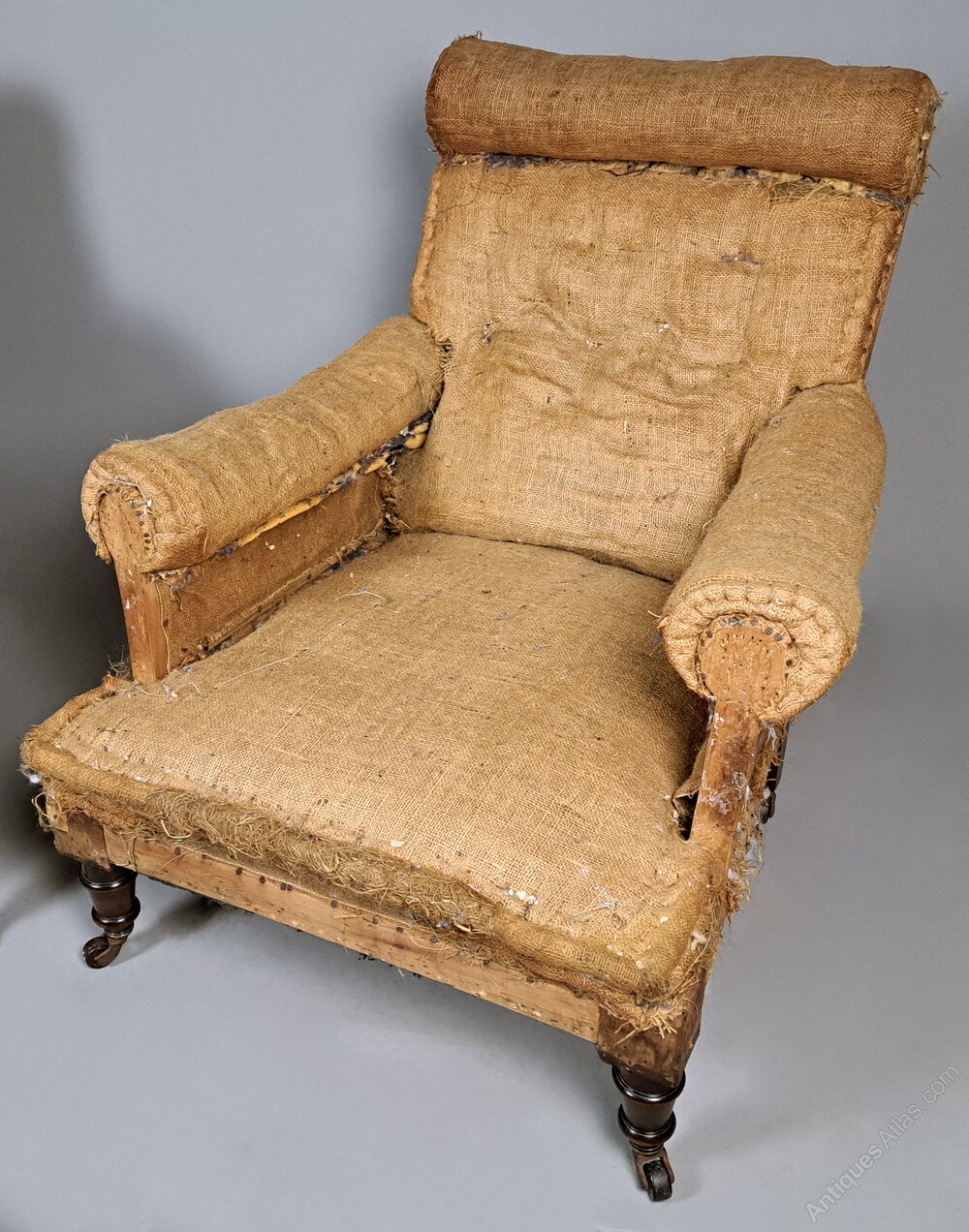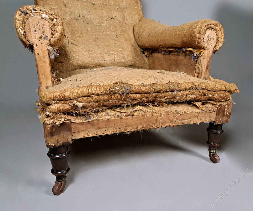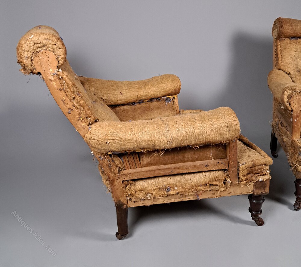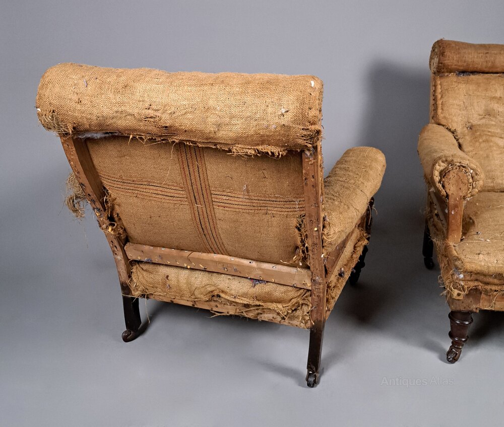 A very good quality pair of late Victorian long and low seated armchairs with rolled arms and padded headrest. Solid mahogany and oak framed with original brass casters, both chairs are heavy and solid with no weakness or loose joints. The fabric was a very worn and torn velvet – not original – and so we have stripped the chairs back to original hessian covering and both chairs retain their original Victorian springing to the seats.
