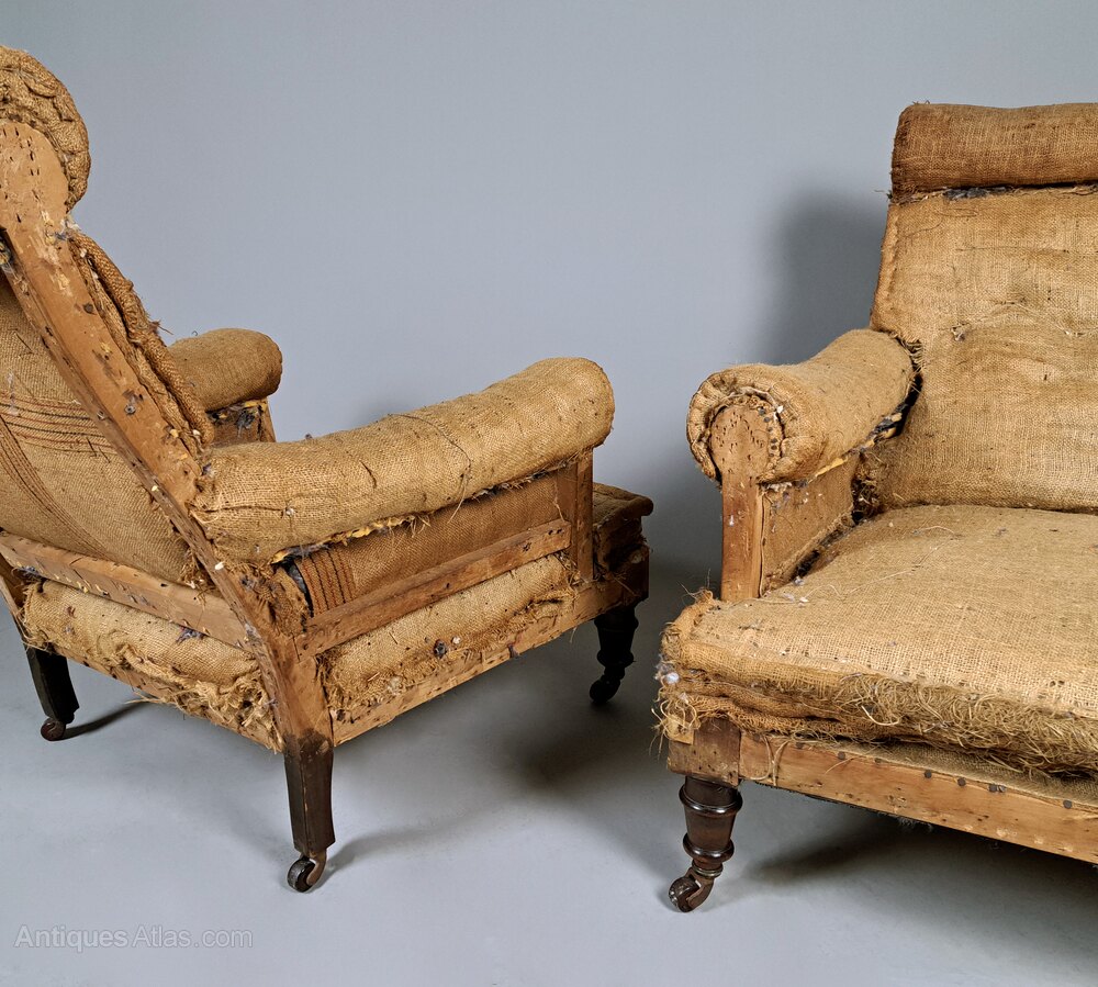The chairs are exceptionally comfortable, beautifully made, unstamped and priced as a pair of Victorian chairs in need of re-upholstery. However, having acquired Howard chairs in the past, everyone here thinks they are by Howard and Sons.