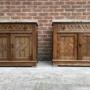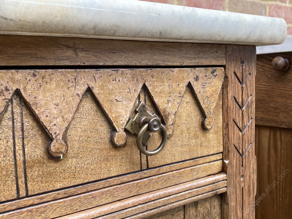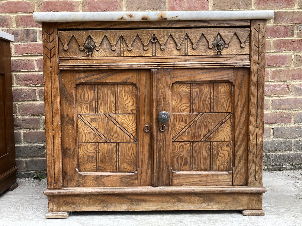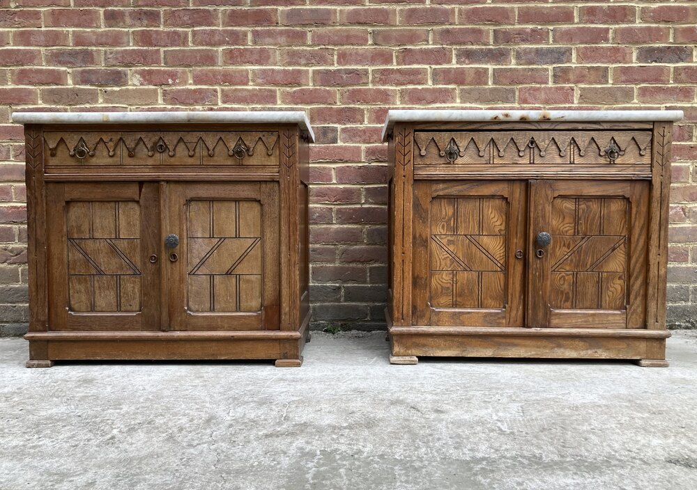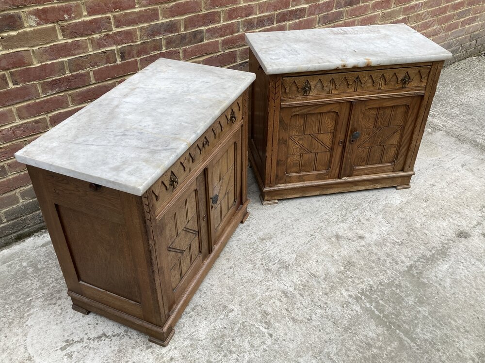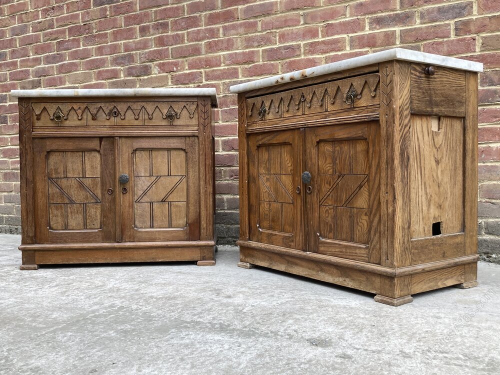 A most unusual find, this lovely pair of marble-topped washstand / cupboards date to around the middle - late 19th century, with strong styling cues from the Aesthetic period.
