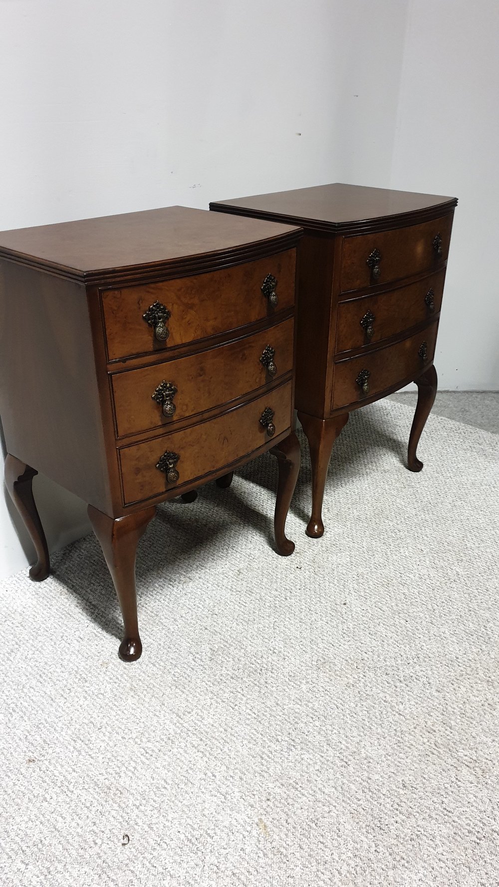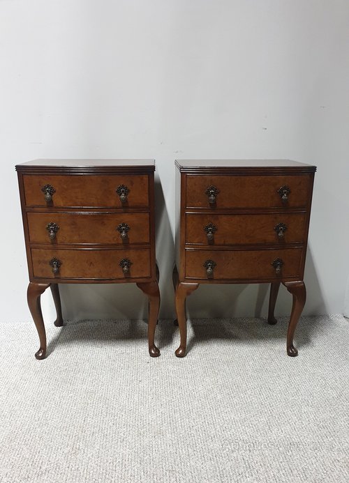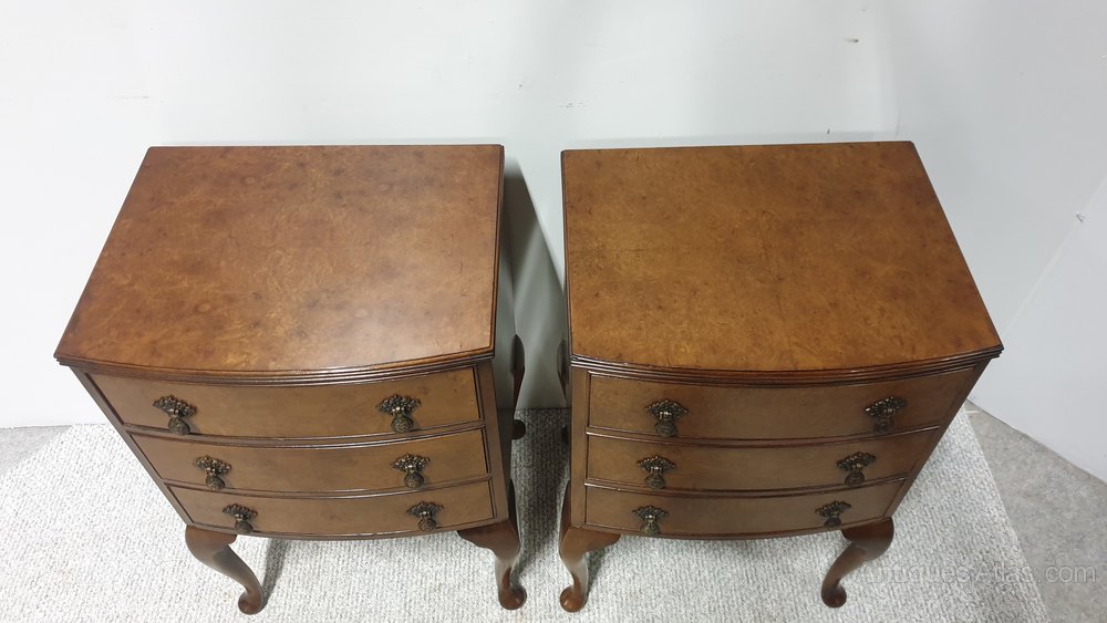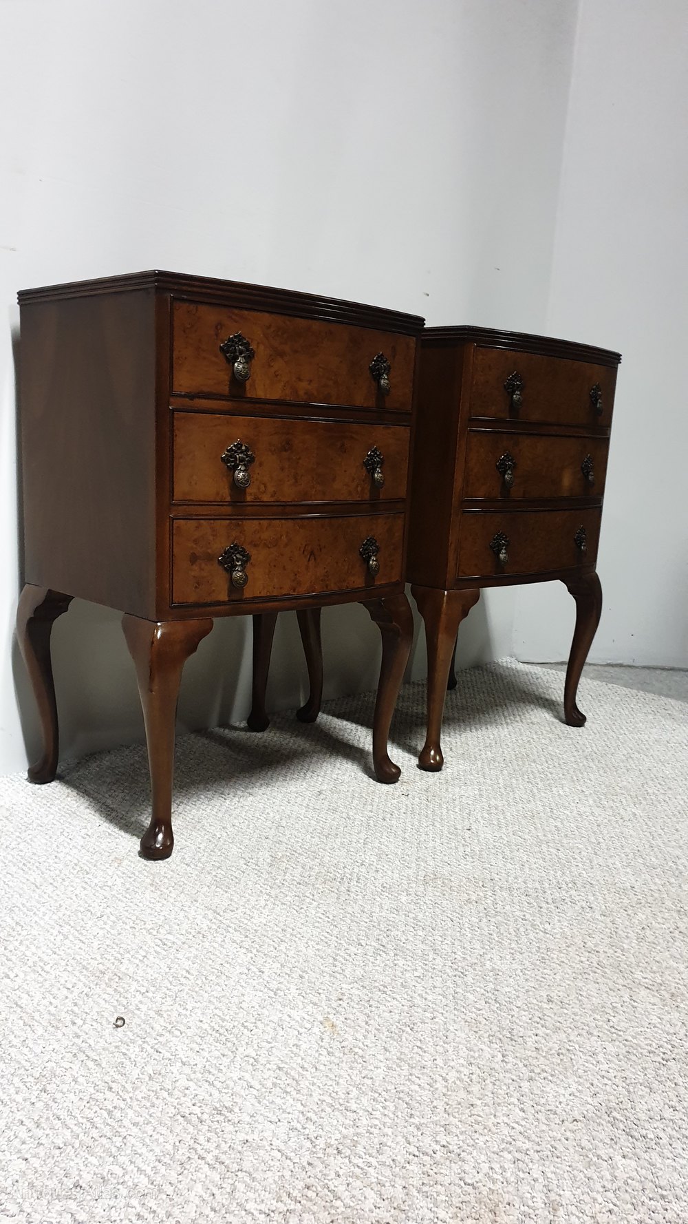 A very nice pair of burr walnut bowed three drawer chests of drawers, lamp chests or bedside chests, brass handles, in excellent original condition.