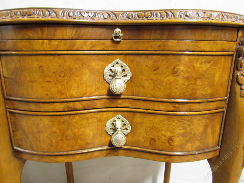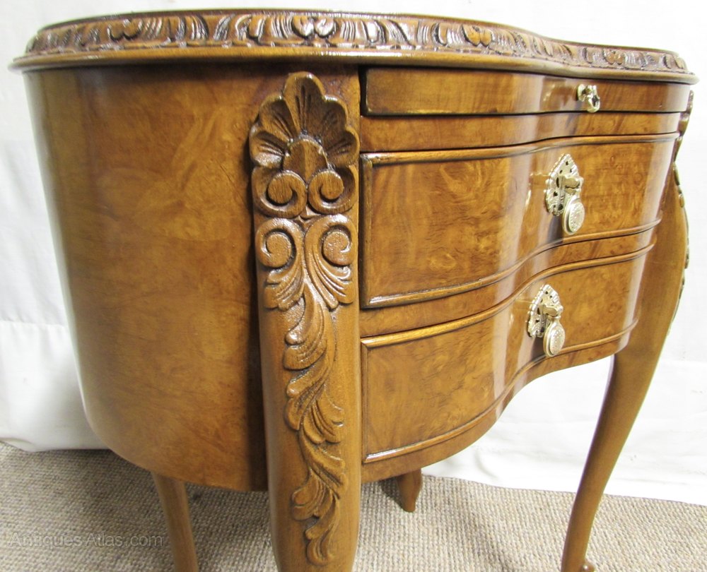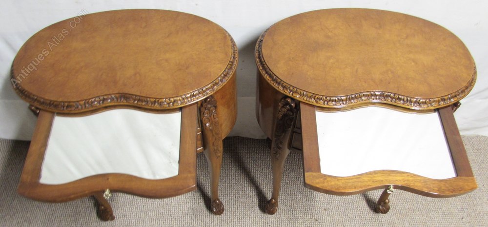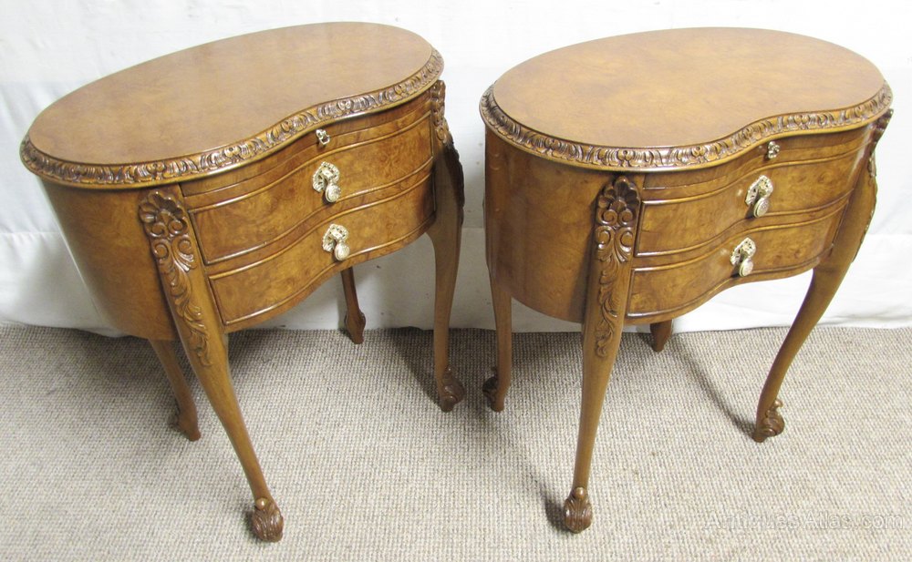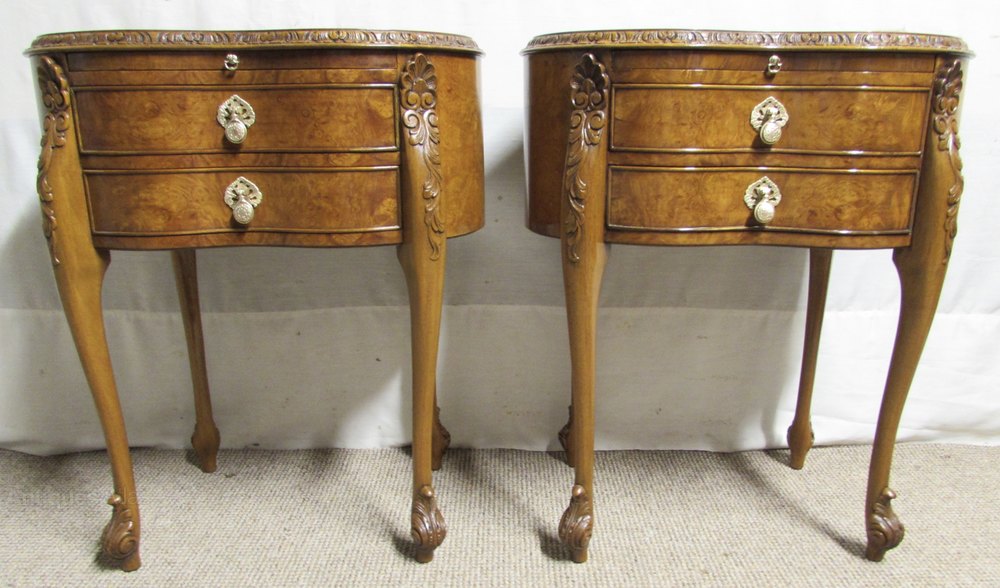 A stunning quality pair of bedside drawers or bedside antique tables, made from Walnut with excellent burr walnut to the tops and right round. Each has 2 smoothly running drawers and a slide above all fitted with original brass handles. The kidney shape is very rare and the quality of these is much higher than the normal, The carved decoration is crisp and well executed, they sit on Queen Anne legs with carved feet.