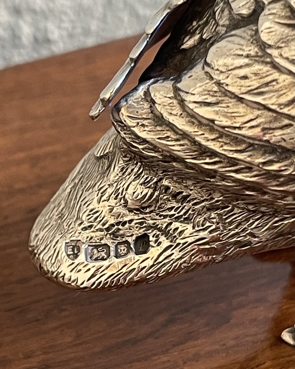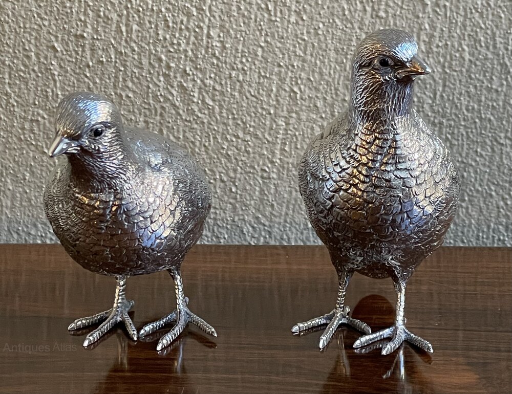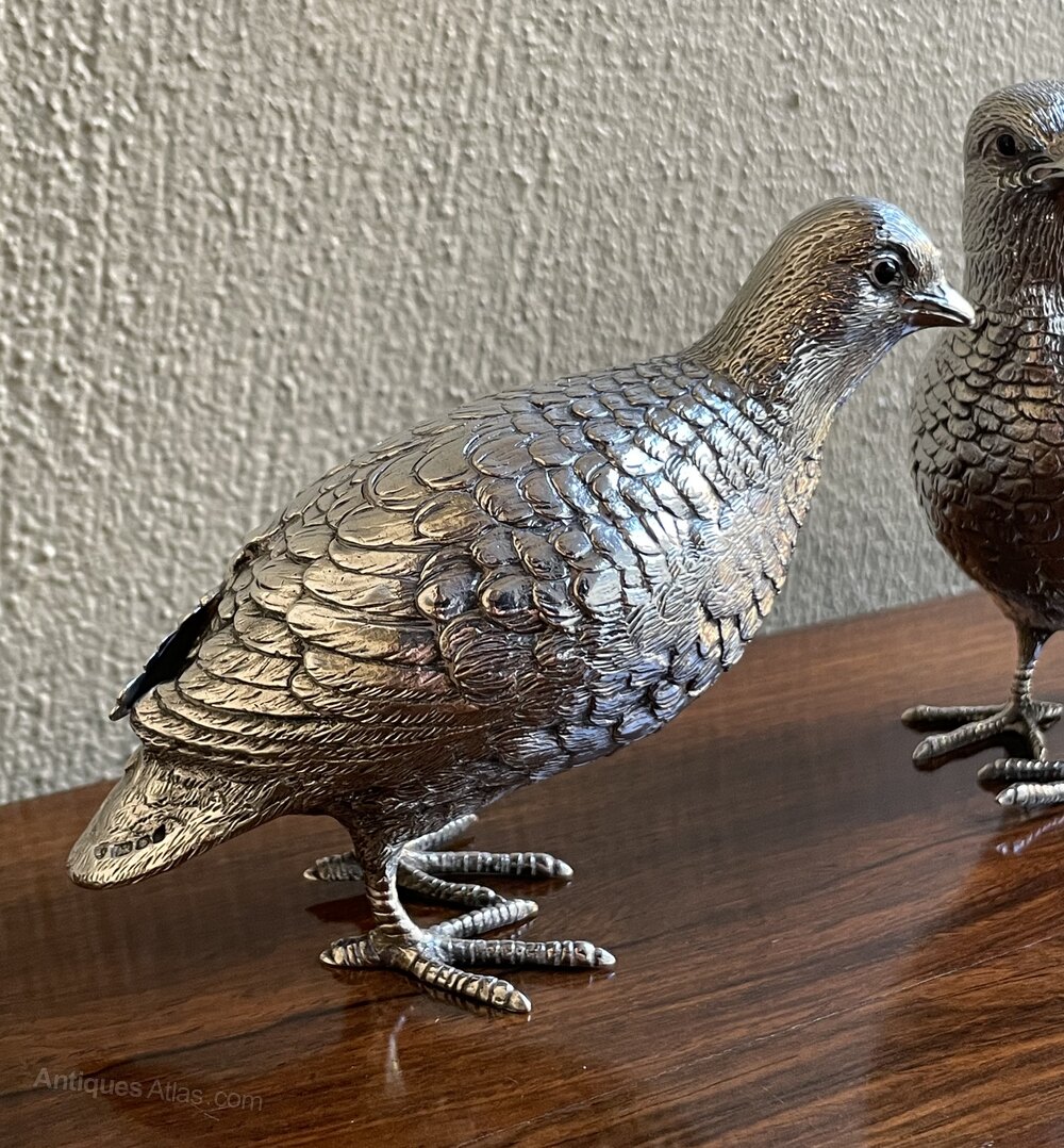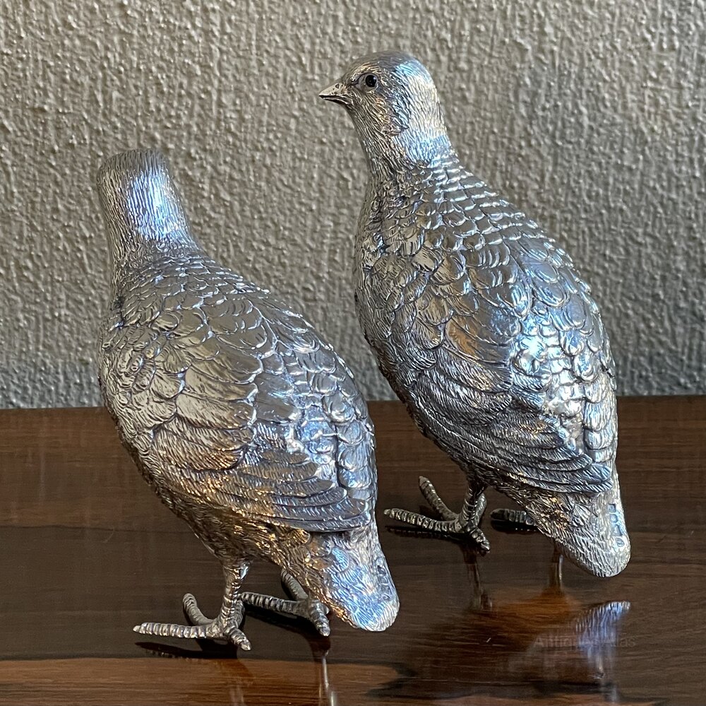 A very handsome pair of Elizabeth II sterling silver models of partridges realistically cast with fine feathered detailing and attractive glass eyes.