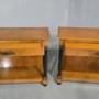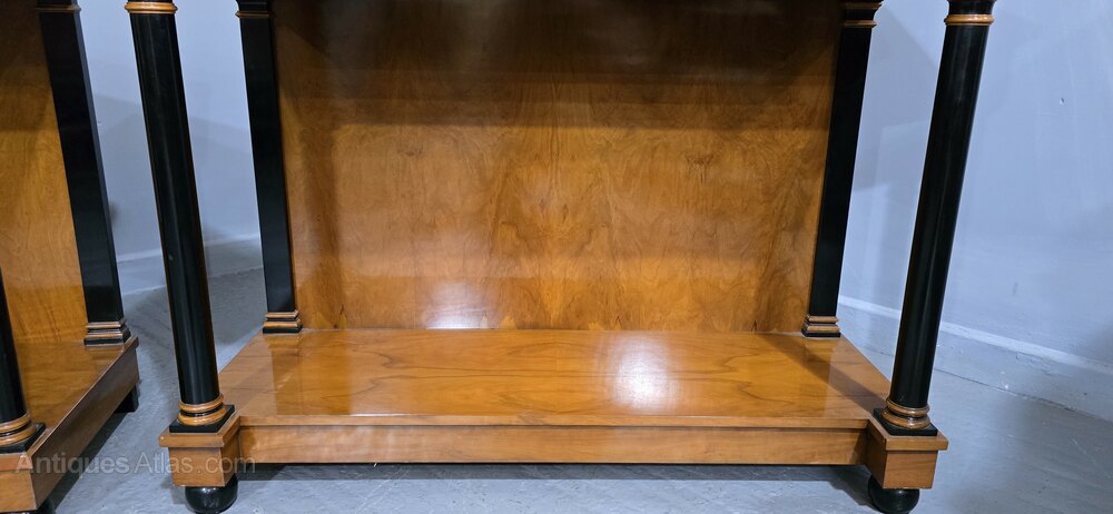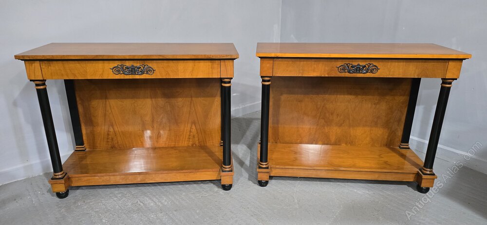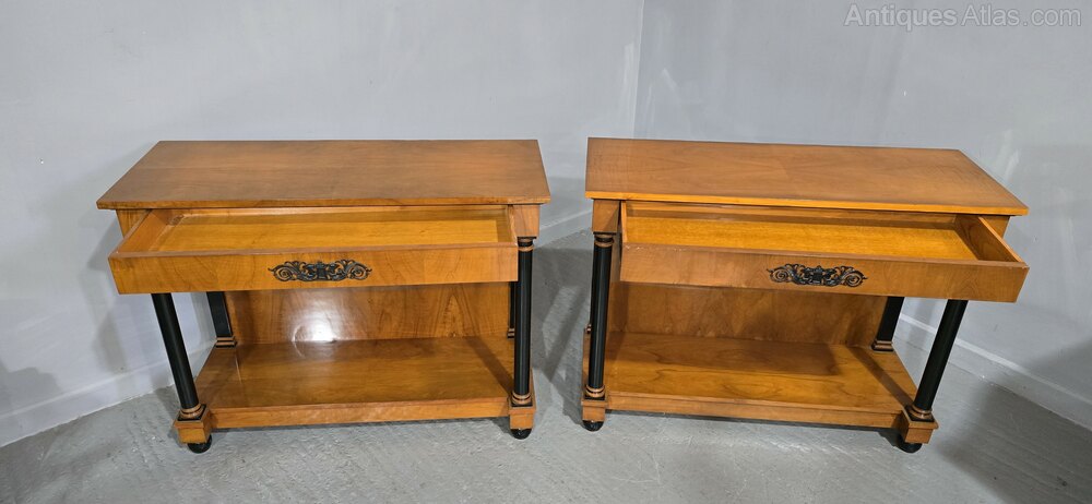 Superb pair of French birch console tables with ebonised ascents, single full width drawers, in overall excellent condition.