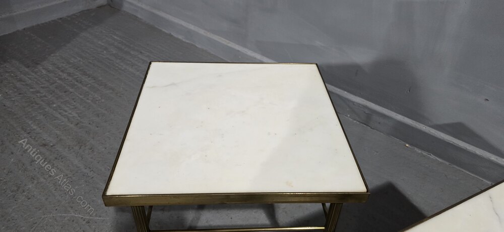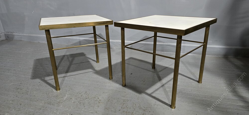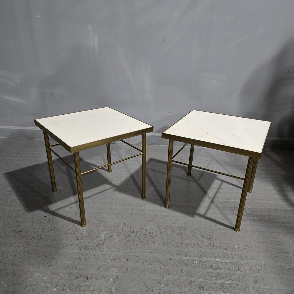 A very good pair of French heavy brass and white marble topped end or lamp tables with reeded legs, in overall very good original condition.