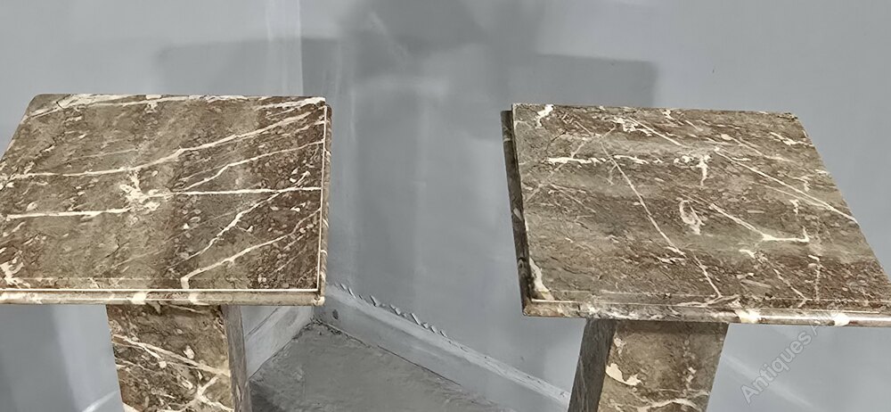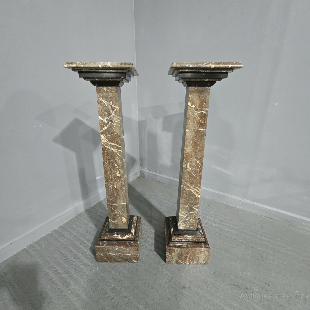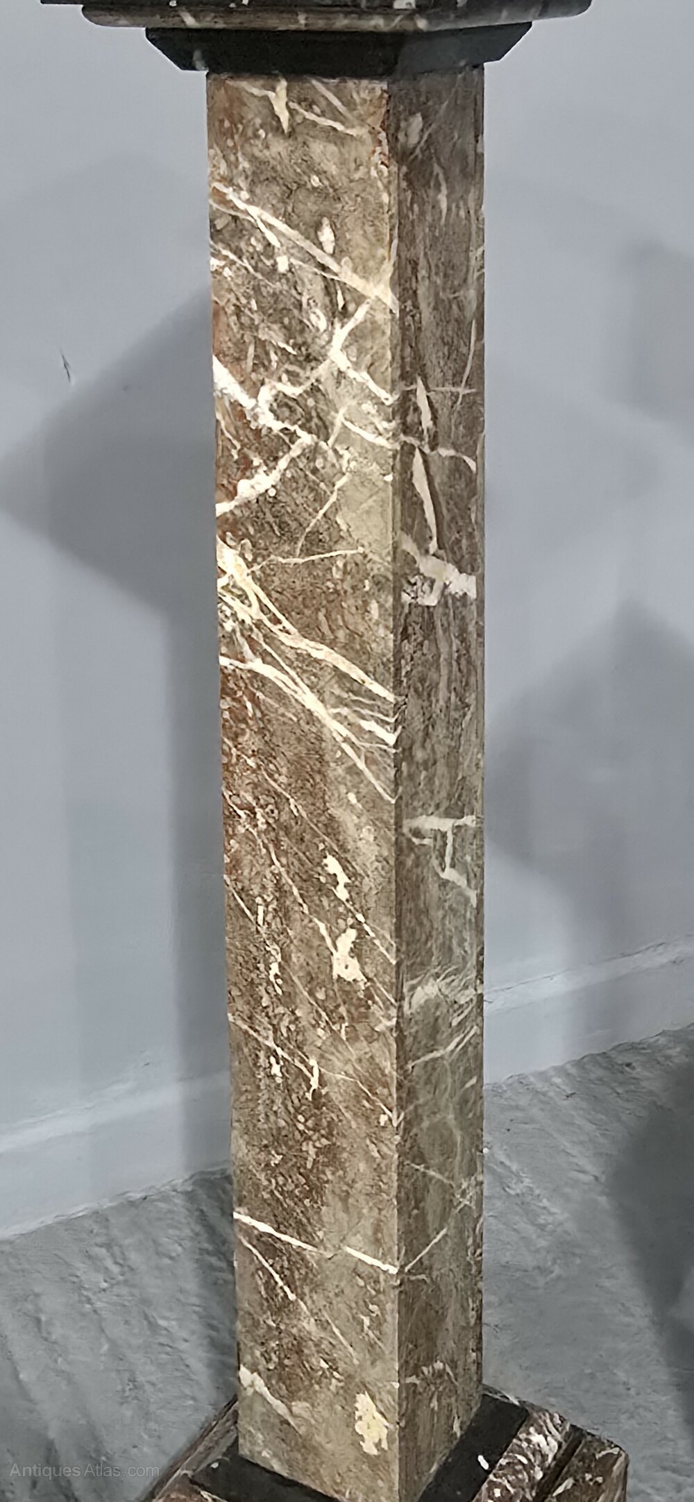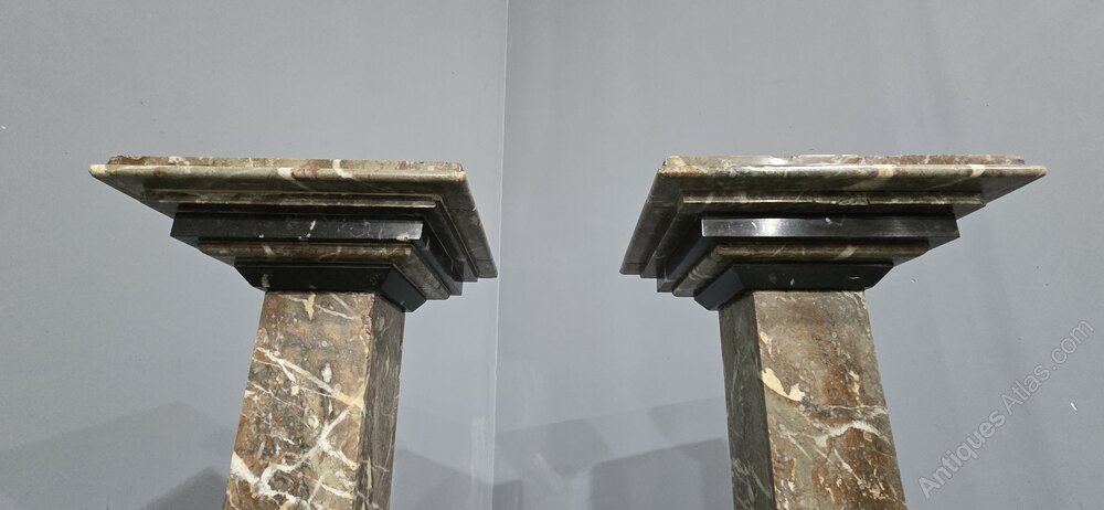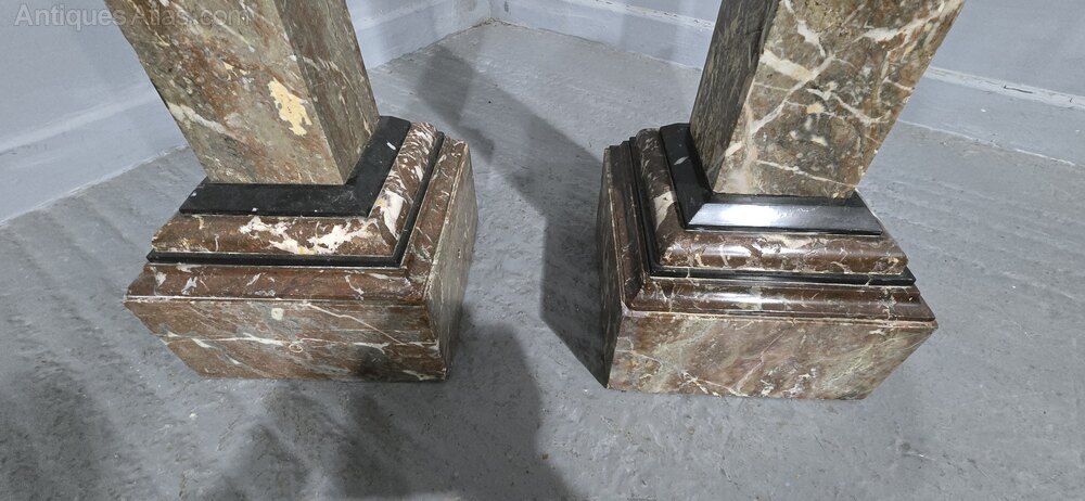 A pair of early XXth century rouge marble columns, each having square top for display above a stepped collar and tapering pedestal terminating in heavy square plinth base. This antique pair of columns is in home ready condition. c1910