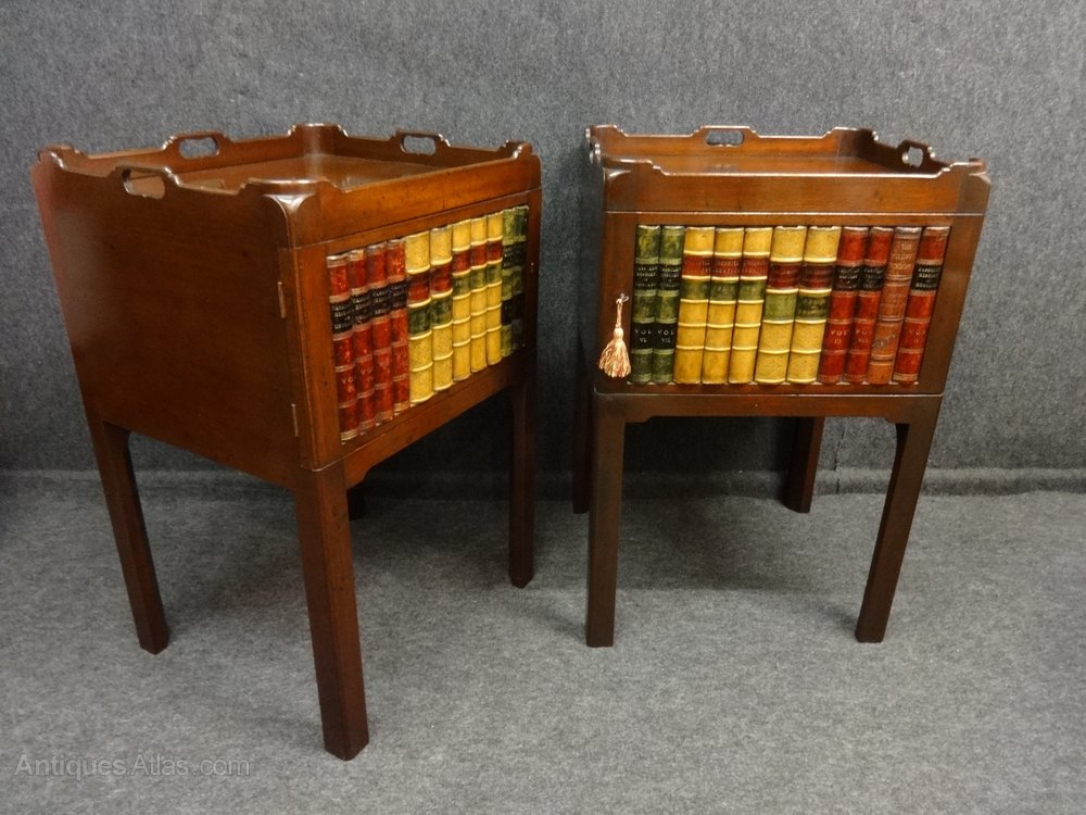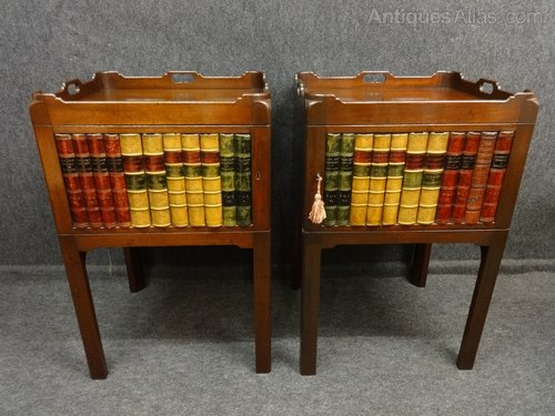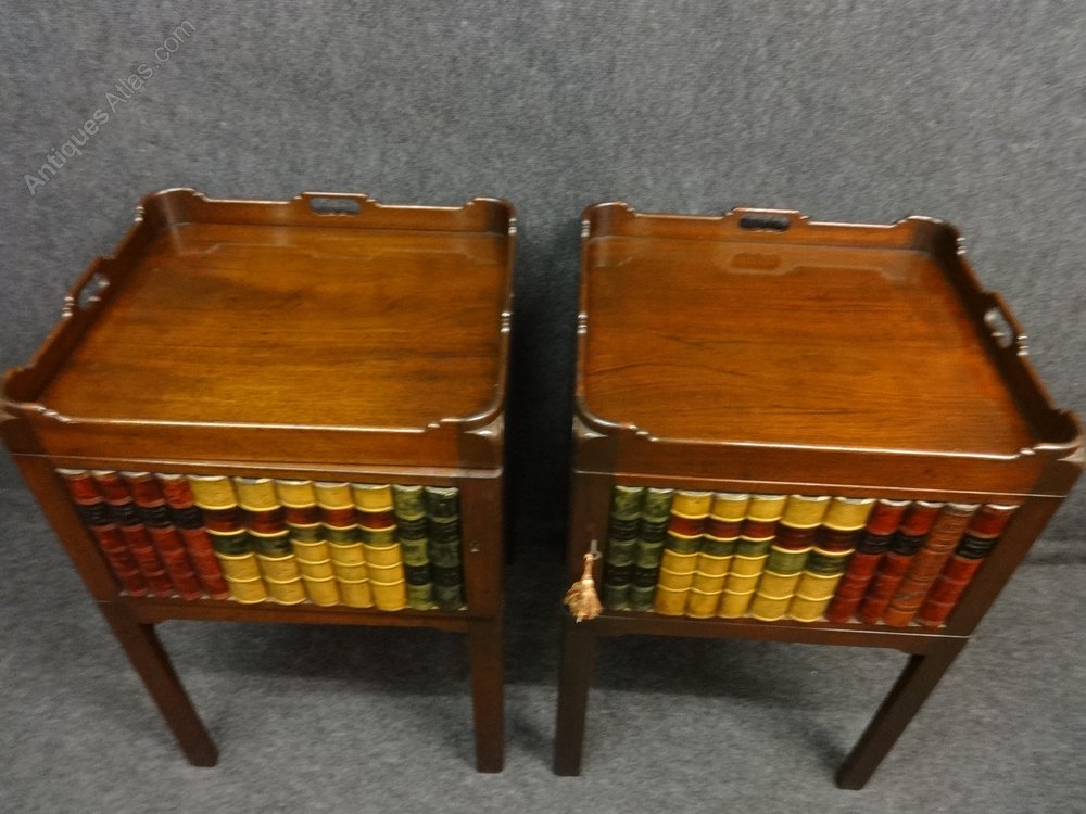 Stunning pair Georgian style bedside cabinets with false bookends on doors, tray tops, with original key, in good original condition.