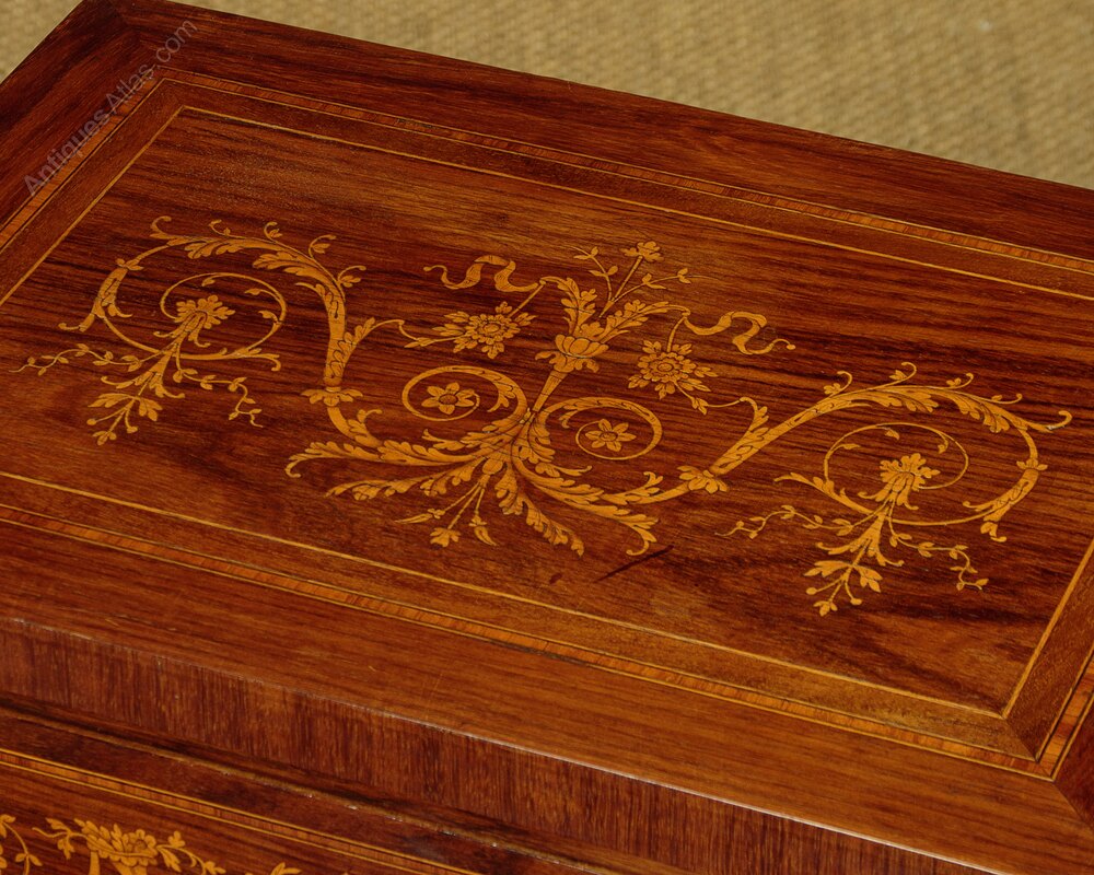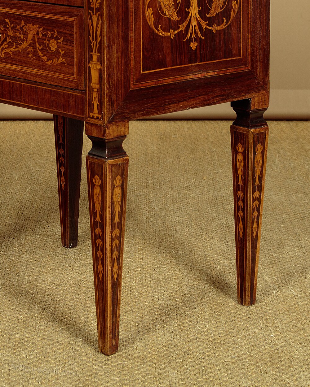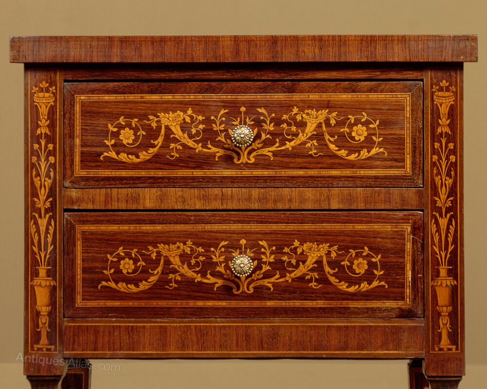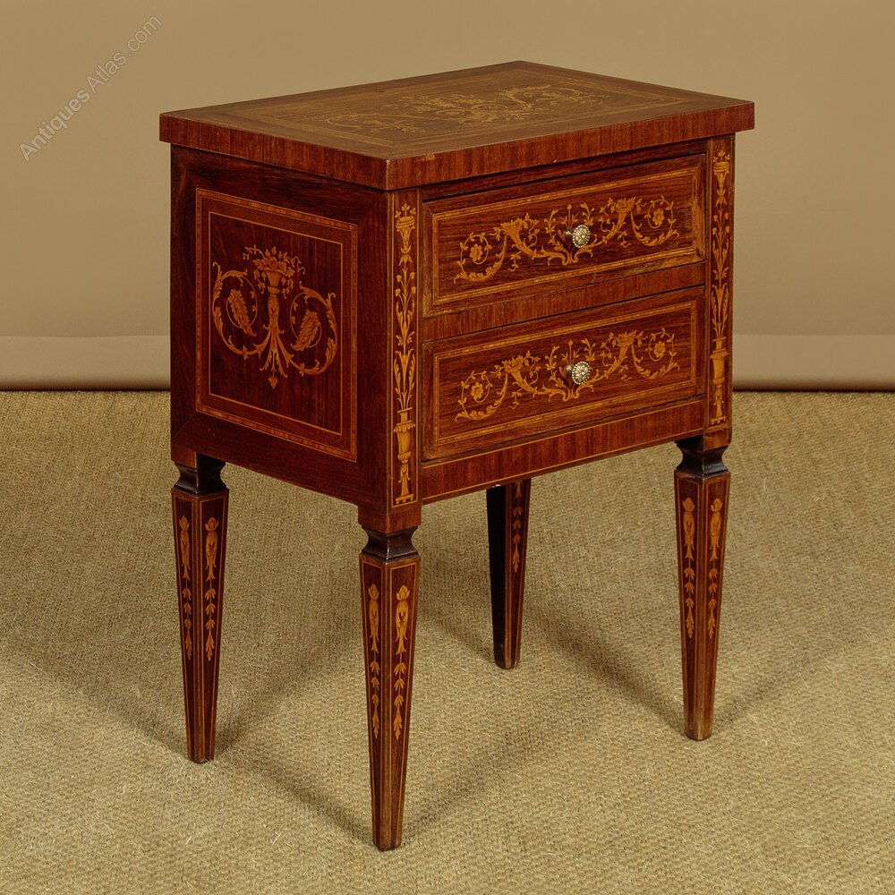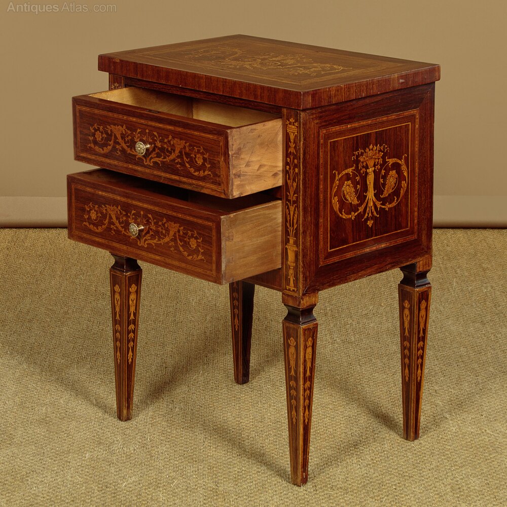 Beautiful pair of Italian marquetry inlaid side antique tables or bedsides c.1930. Two drawer cabinets veneered in rosewood and inlaid with superb quality Classical style marquetry decoration of scrolling foliate forms across the tops, drawer front and sides. Set within crossbanded satinwood and boxwood strung borders. Note the vase and flower decoration to the uprights flanking the drawer fronts. Raised on square tapering legs also marquetry inlaid. Original patterned brass knobs and maker's labels for Mobili IMEA of La Spezia on the Ligurian coast. Excellent colour and condition, cleaned and waxed in our workshops.
