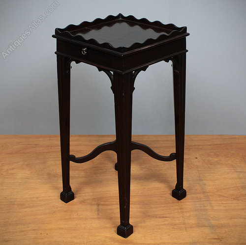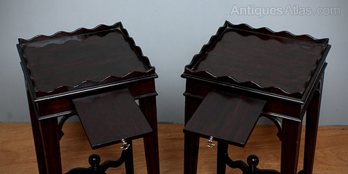 Good looking pair of Edwardian mahogany ‘kettle stand’ side antique tables c.1900. Square tops with a shaped gallery and pull out cup rest with brass drop handle. On tapered square legs with carved bracket and shaped stretchers meeting in a ball finial. Excellent condition.