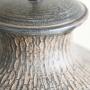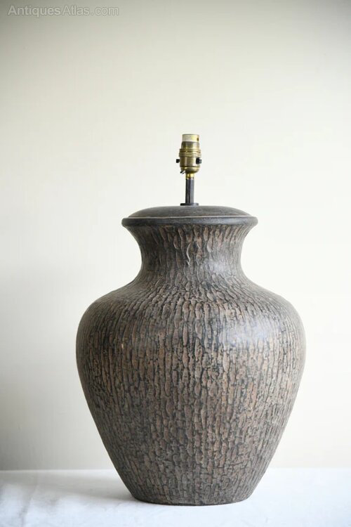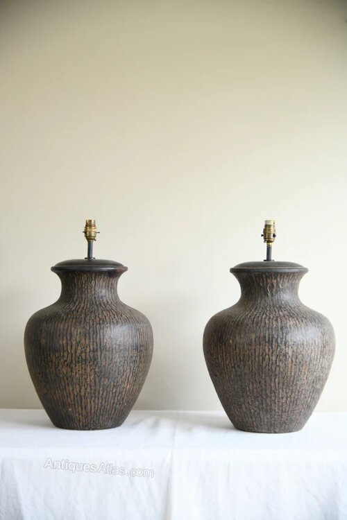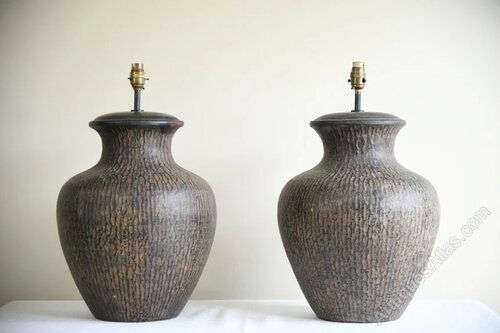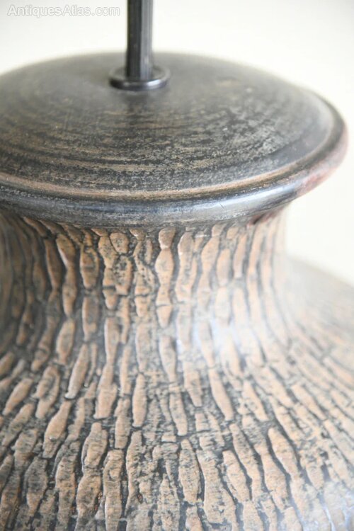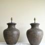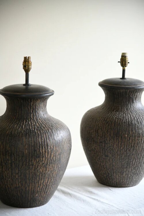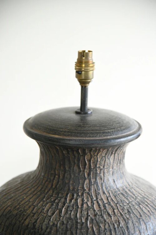 Pair Large Contemporary Table Lamps. A striking pair of large metal table lamps with a rounded vase shape and textured metal bronze finish. Ideal as statement lamps for a console, sideboard or bedside tables.A bold and stylish pair ready for shades of your choice.