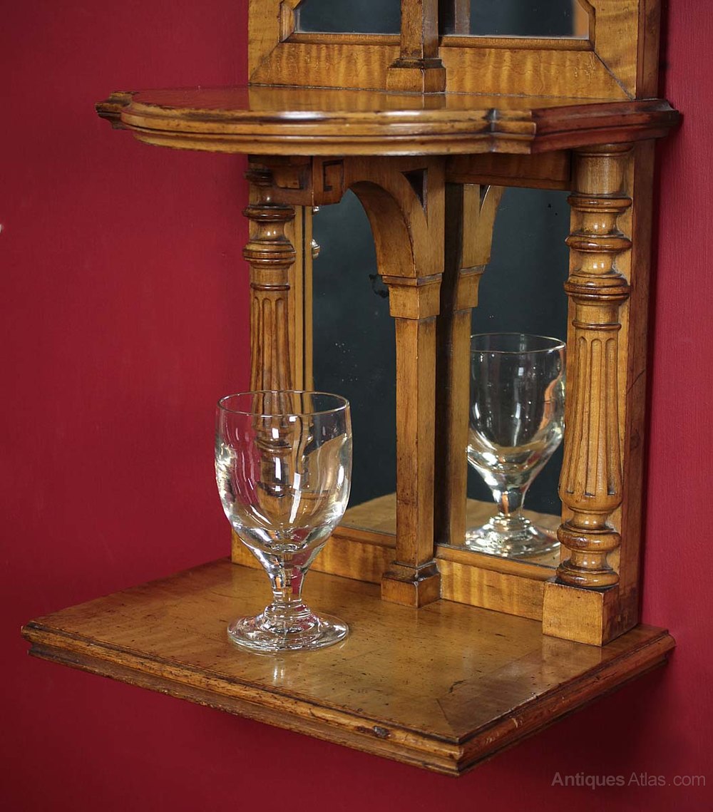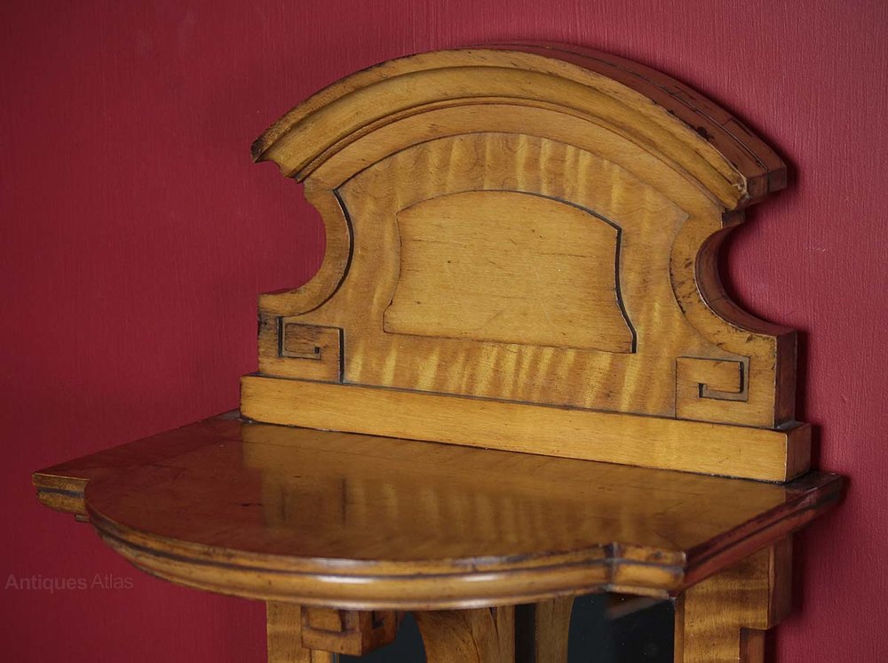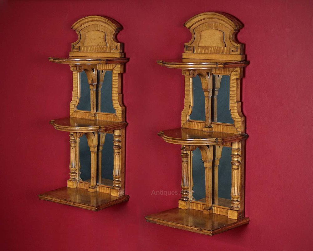 Fine pair of mid 19th.c. three tier mirrored wall brackets c.1870. In satin birch with a moulded arched cornice over three shaped and crossbanded shelves with moulded edges and carved faux columns to the lower tier. Mirrored back panels designed to reflect lamp light. A small amount of tarnish to two of the mirror plates and a small crack to one otherwise excellent condition, cleaned and polished in our workshops.