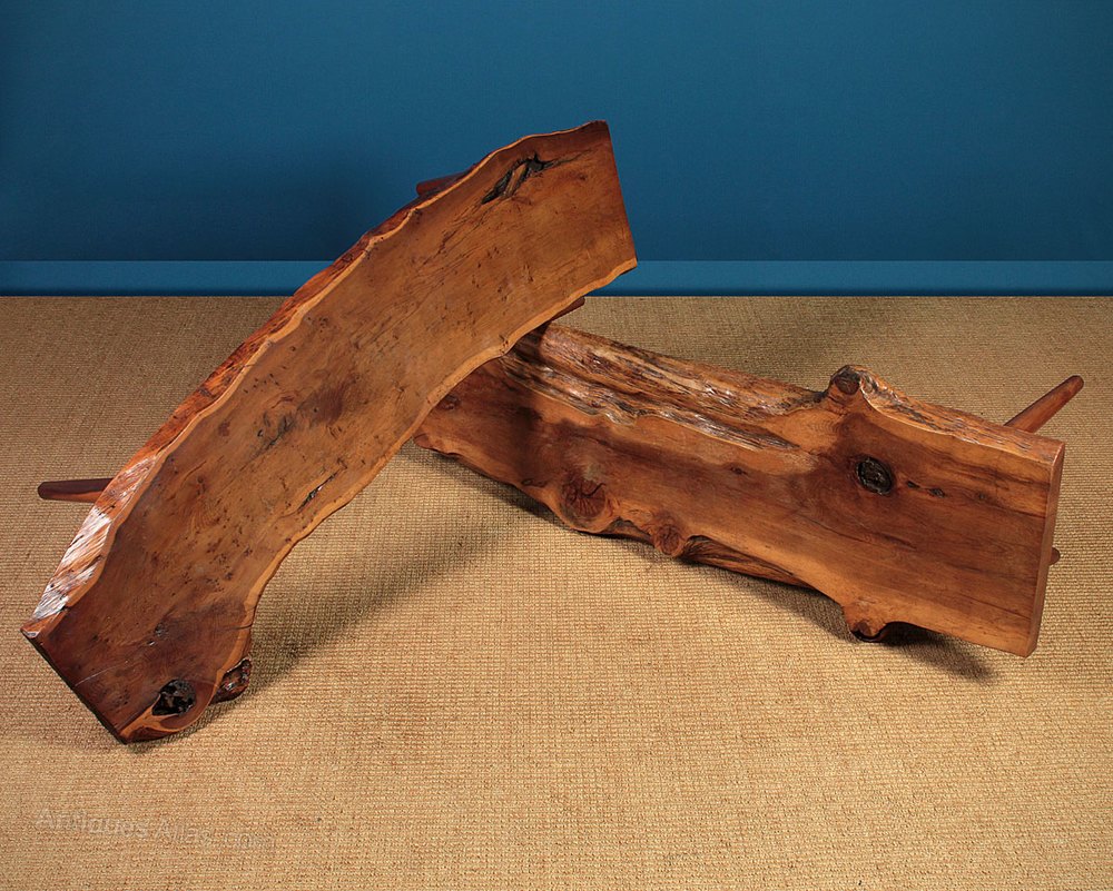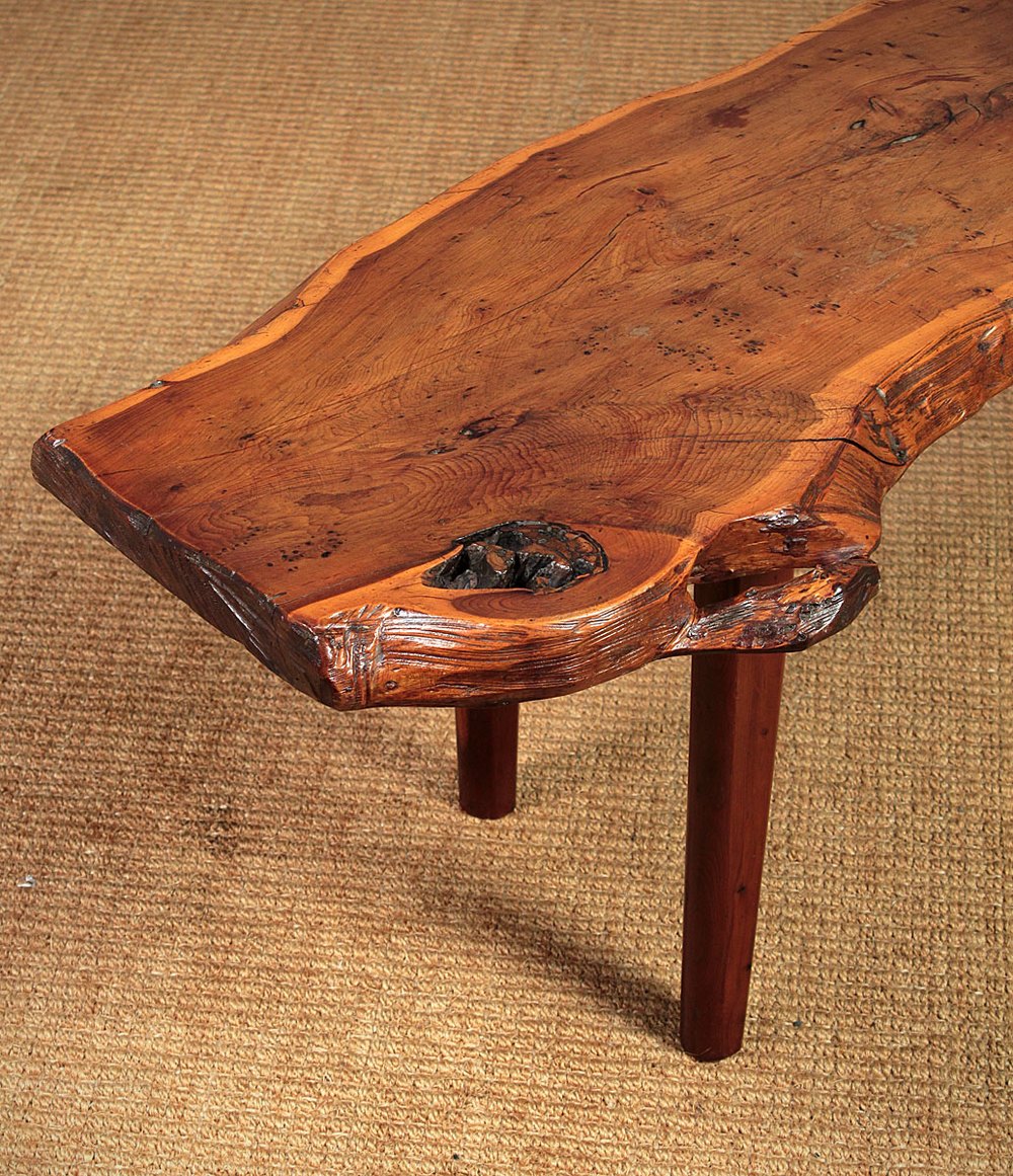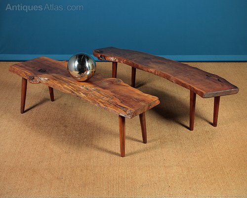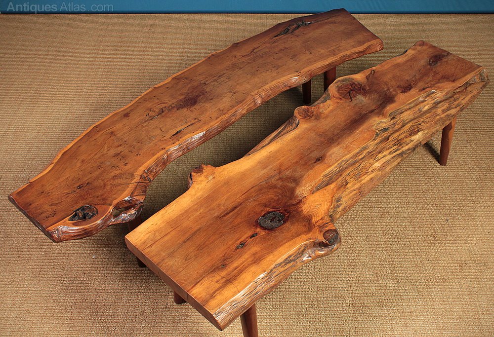 Interesting pair of mid century modern coffee antique tables c.1960. Beautiful 1½” and 2″ thick yew wood planks on four tapering legs, also in yew. Like the antique furniture of the celebrated US designer George Nakashima these tables celebrate and express the natural origin of the materials the sides of the tables retain their original organic profile whilst the tops are polished smooth to show off the remarkable grain. Excellent condition with original maker’s label from Reynolds on the underside of the curved table. Price is for each table.