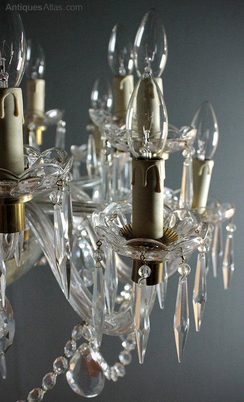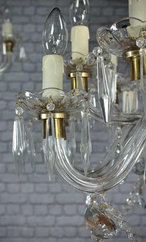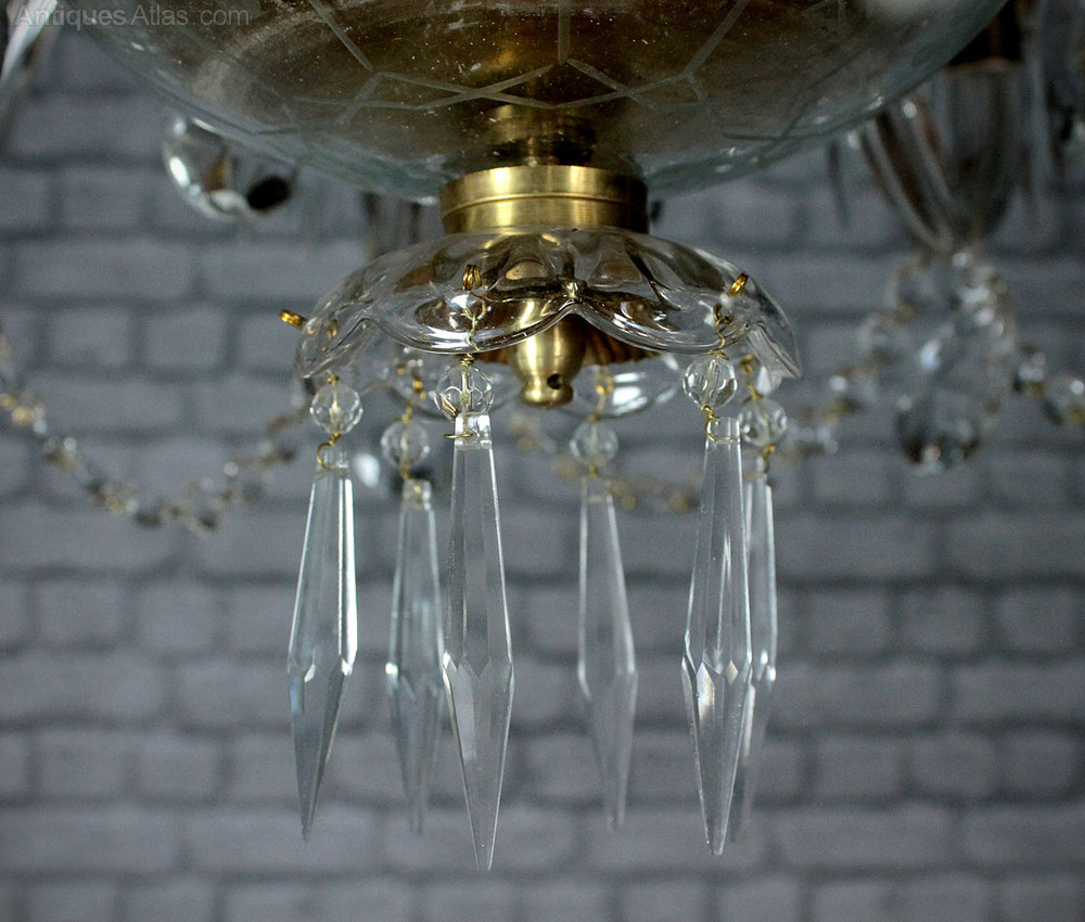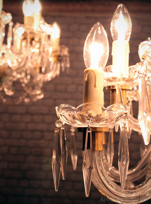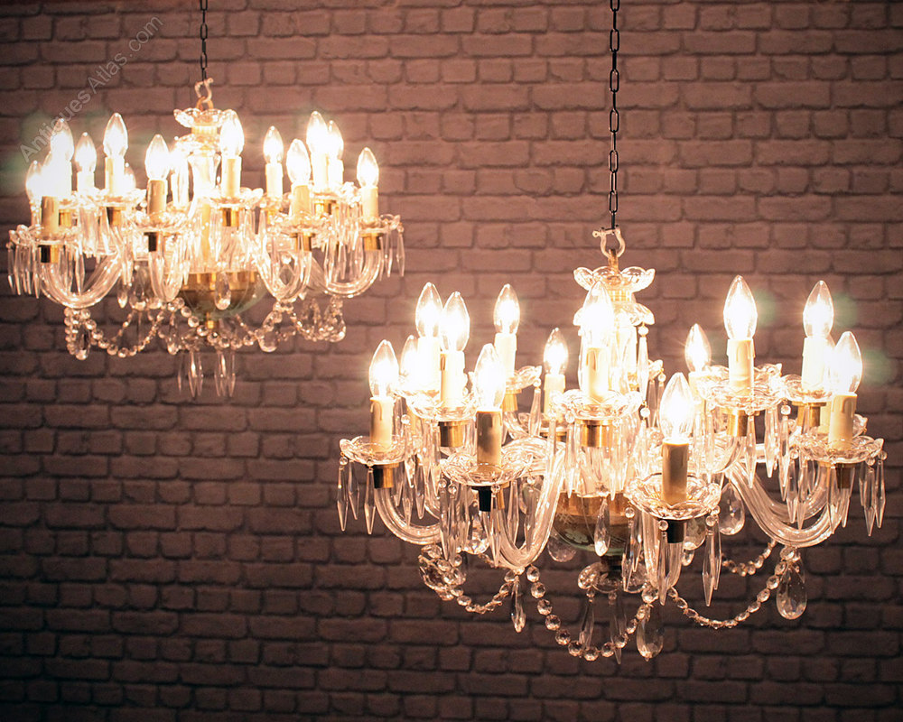 Fabulous pair of large glass chandeliers c.1930. Compact size but with 16 bulbs to each they provide an impressive level of illumination without requiring an enormous ceiling height. With shaped braches, brass fittings, etched detail and crystal drops. Excellent condition, rewired and ready to hang.