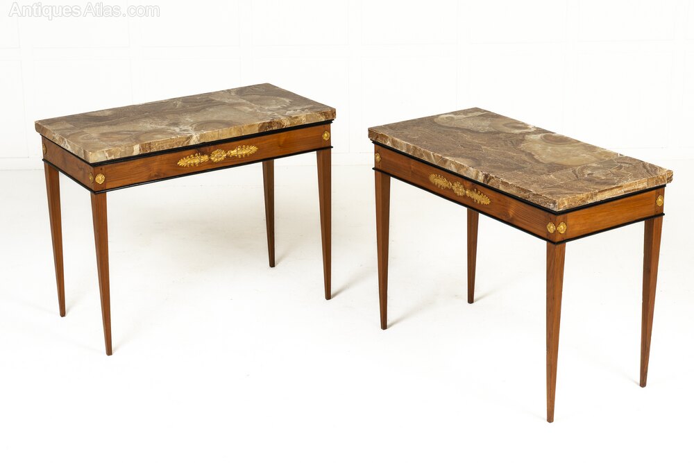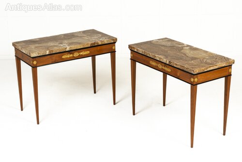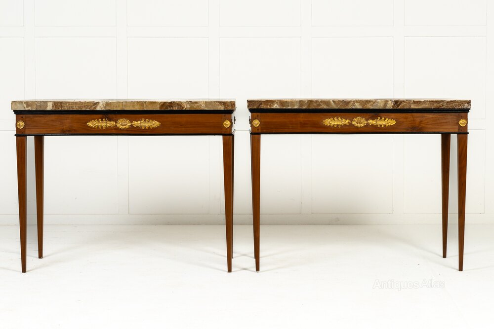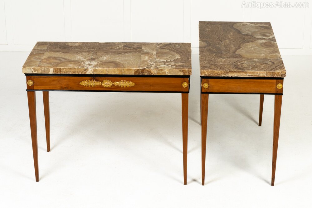 These elegant tables were made towards the end of the 18th century in Italy and their plain rectangular forms with tapering square sectioned legs are ornamented with ormolu mounts above each leg, also on the side friezes, and larger central mounts incorporating stylised anthemion and a floral paterae. The tables retain their original alabaster tops which are of exceptional quality and figure. Tops of this quality would have been highly prized and the maker of these tables took care to create table frames which enhanced the tops with nice ebonised detailed mouldings.