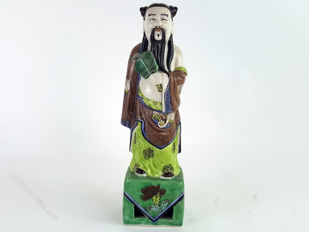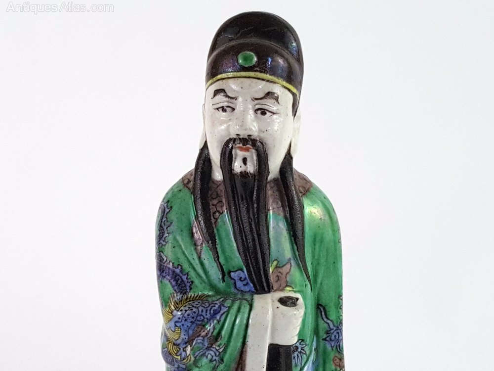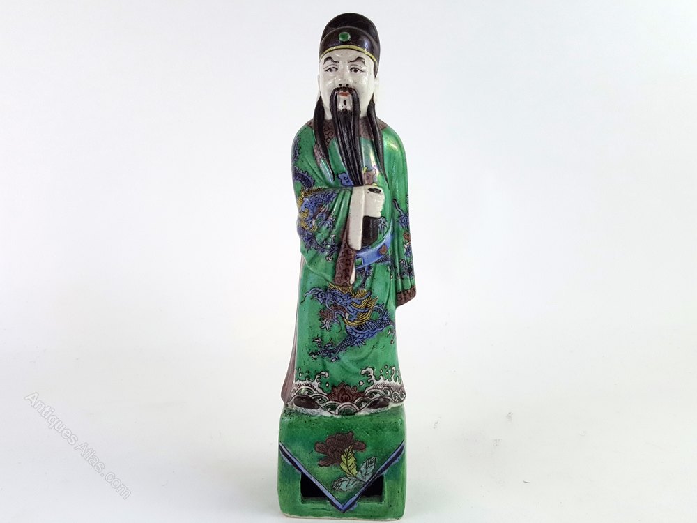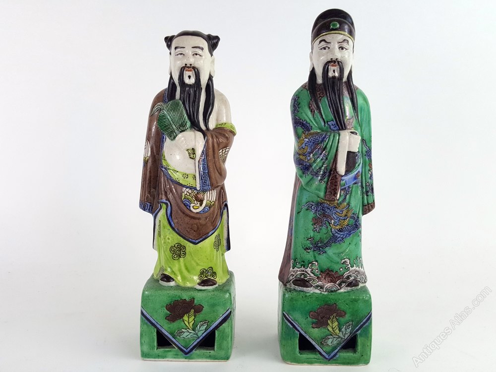 Pair early 20th Century noblemen. one is dressed in his green & brown robe, with pattern of a bird while holding a fan in one hand, the other is dressed in vibrant green colour with patterns of dragons, while holding a black bag, both stand on a stand, One bears signature to base.
