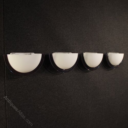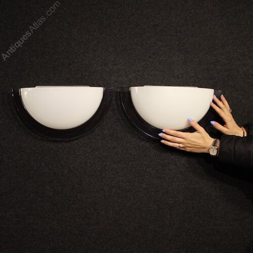 Pair of Italian wall lamps from the 1970s. Italian-made items of beautiful lines and taste, ideal for antique dealers and interior decorators. Half-moon colored glass wall lamps complete with metal wall brackets (see photo). Each bracket has a light bulb slot. The electrical system is missing and requires electrification (see photo).