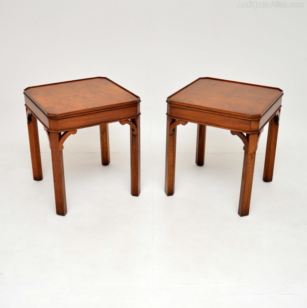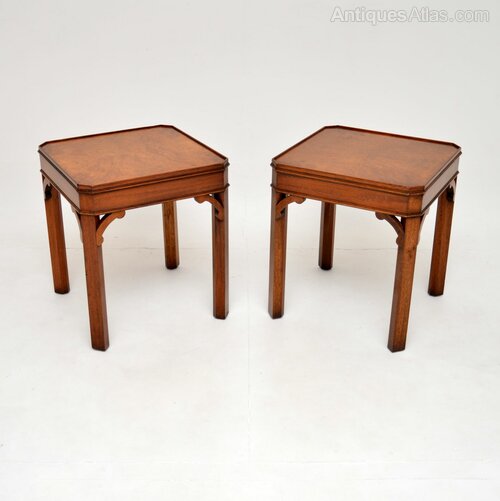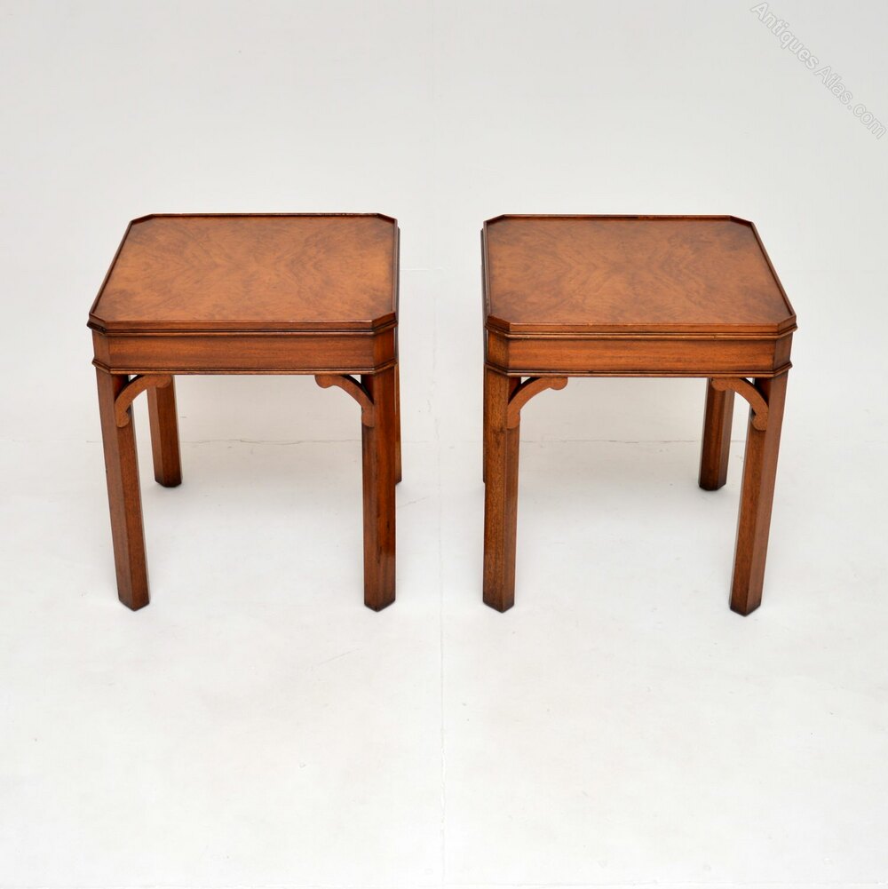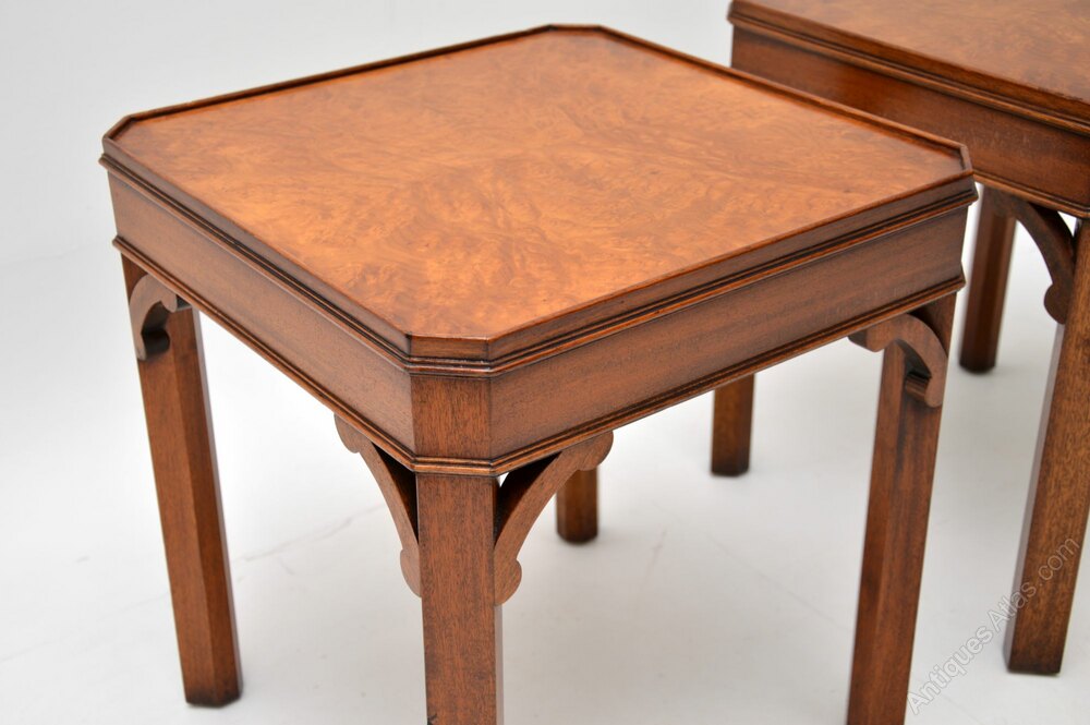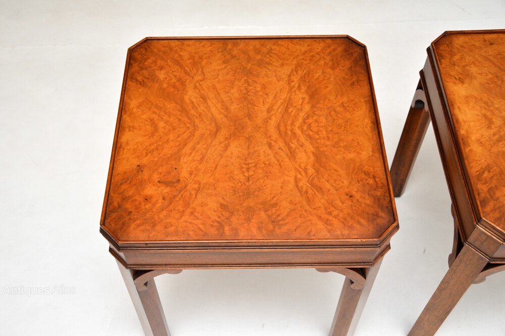 The quality is superb and they are a very useful size. The square tops have absolutely stunning burr walnut grain patterns, canted corners and lovely fretwork supports under the corners.